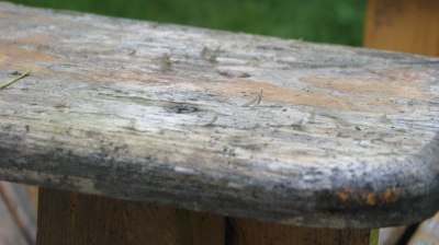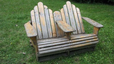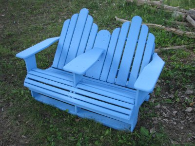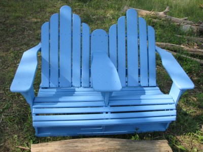 A good cookout requires comfy seating for guests. Luckily we have this much beloved double Adirondack chair, which was actually made by Brandon’s sister Bri in high school. It was a happy fixture on our old porch in Ohio, and witness to many good times there. However, since we lacked a garage or functional basement for storage, it also weathered every rain-, hail- and snowstorm that passed through over the past few years. As a result, it was looking a little bit worn, with peeling finish that would stick to you if you sat in it.