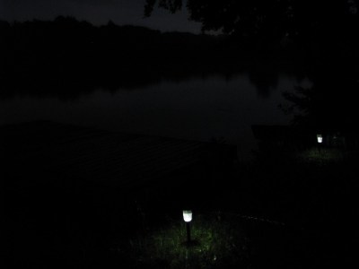 While at Lowe’s today, we also picked up three solar powered lights to add a little ambiance and avoid mishaps after dark. I put one by the small bridge I built to go over our stream, since it is between the cookout zone and the driveway where people park so it gets a lot of traffic after dark.