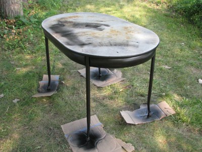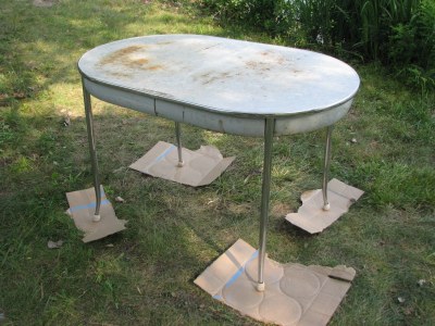 And now apparently I’ve been bitten by the painting bug. After making the chair so purdy, today I turned my attention to the sturdy table that we use for cookout food prep. It may not be the prettiest thing ever, but the price ($0 on Craigslist) was right, and its unfortunate looks were nothing that some spraypaint couldn’t remedy.