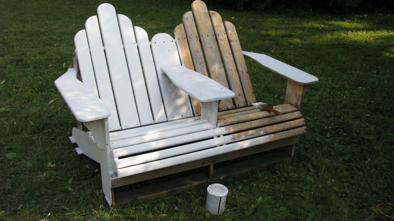 A good cookout requires comfy seating for guests. Luckily we have this much beloved double Adirondack chair, which was actually made by Brandon’s sister Bri in high school. It was a happy fixture on our old porch in Ohio, and witness to many good times there. However, since we lacked a garage or functional basement for storage, it also weathered every rain-, hail- and snowstorm that passed through over the past few years. As a result, it was looking a little bit worn, with peeling finish that would stick to you if you sat in it.