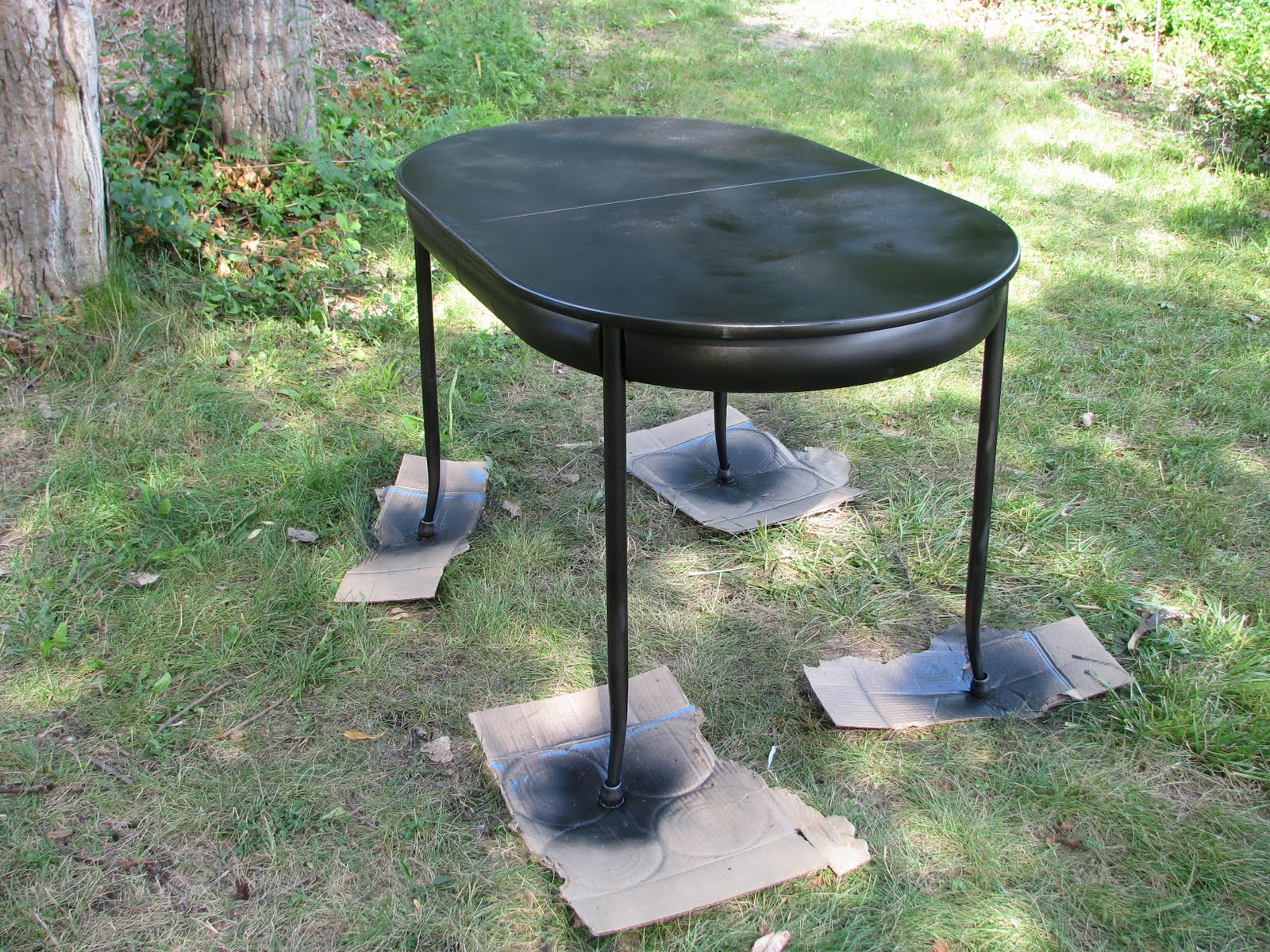 [Edit to add: Here is a photo of the table after another can of spraypaint – it was still a bit wet, hence the “blotchiness.” I think I will probably sand the top and add another coat at some point, but I am pretty happy with it!]