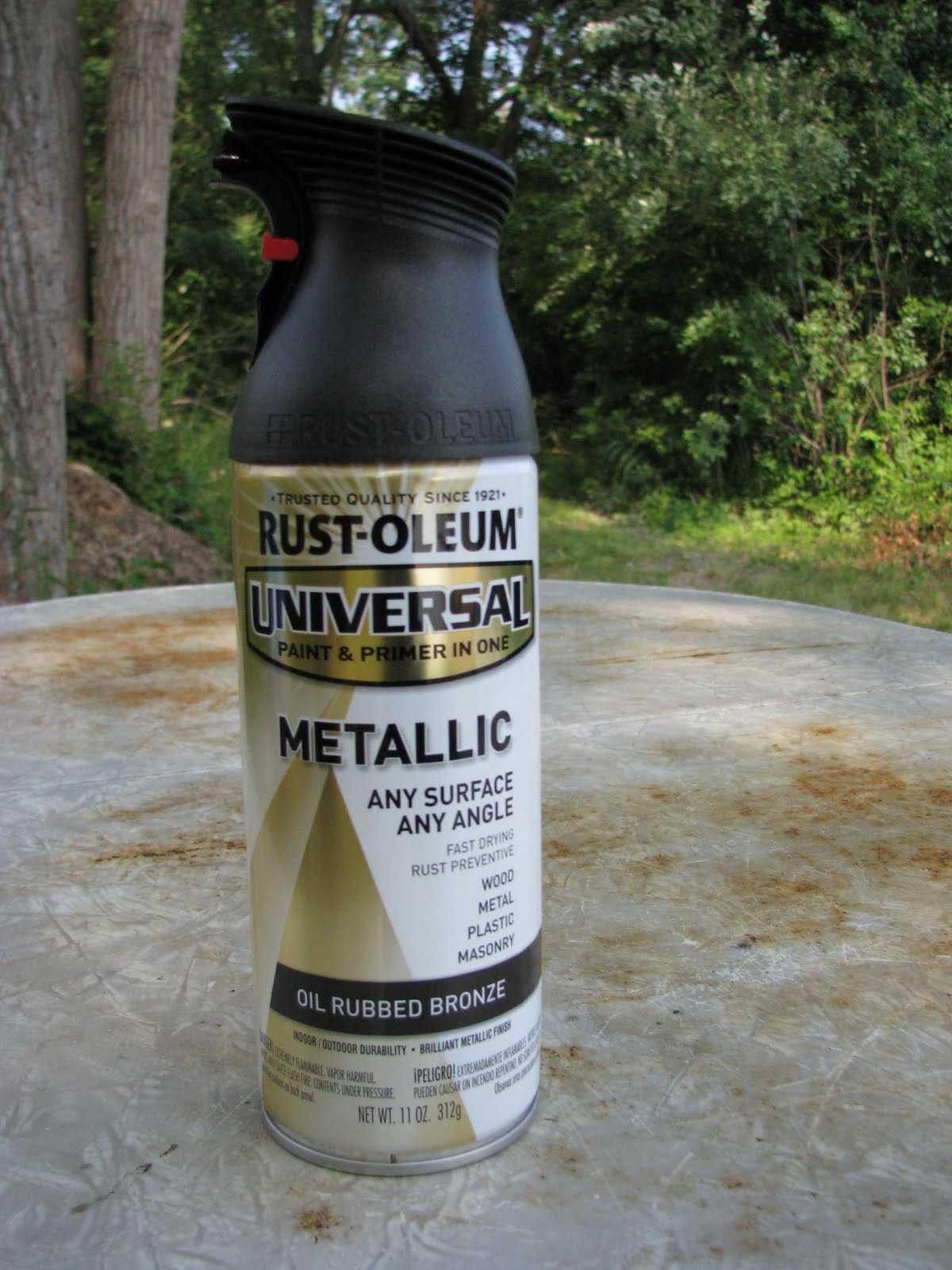 That’s right – I RAN OUT with only the table top left to do. Let me tell you, I was supremely annoyed. However, it was looking amazingly improved already! The paint has a really neat metallic finish, and promises to prevent rust, so I hope this table will be serving up cookout fare for years to come. In any case, I’ll be making another trip to Lowe’s tomorrow to pick up a second can, so I will update this post with the finished product soon!