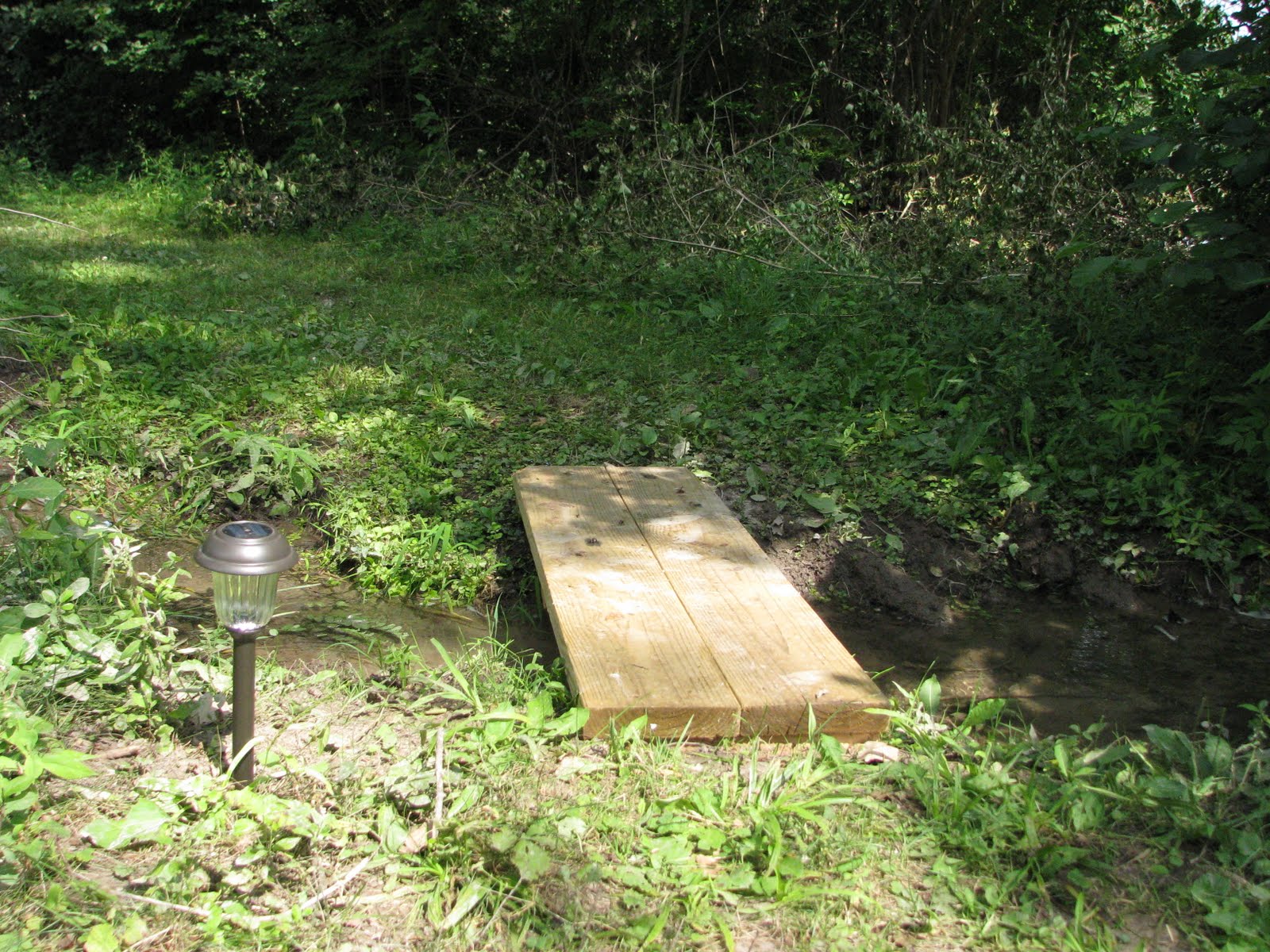 While at Lowe’s today, we also picked up three solar powered lights to add a little ambiance and avoid mishaps after dark. I put one by the small bridge I built to go over our stream, since it is between the cookout zone and the driveway where people park so it gets a lot of traffic after dark.