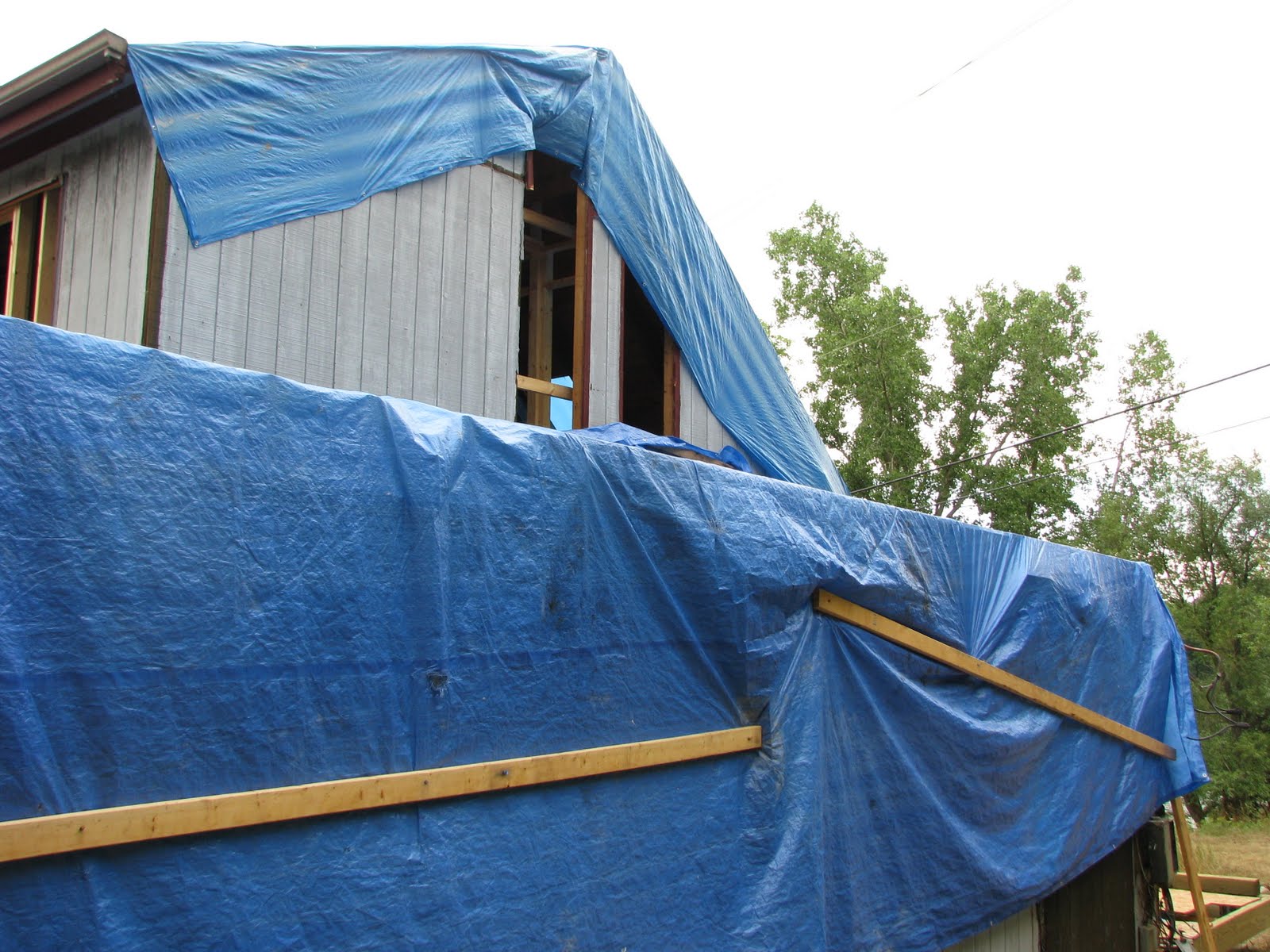 Before all the tarps were up we could see that they’d removed all the shingles as well as the underlying plywood. The existing roof actually wasn’t in terrible shape, but we are replacing all of the fiberglass insulation in the house with more eco-friendly (and health-friendly) blown-in cellulose. The original plan was to add insulation to the inside of the roof (i.e., the ceiling), but we decided this wouldn’t work because we really wanted to keep the existing visual aesthetic of the ceiling.