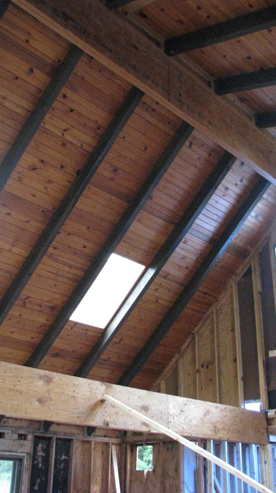 Insulating from the inside would have meant covering the beams and decking with drywall, which would have been a huge bummer. And since the roof was going to need to be replaced in the not-too-distant future anyway, we decided that doing it now and insulating above the decking was the way to go. We originally considered spray foam insulation, which does have a higher r-value than cellulose (in other words, it prevents heat exchange better). However, I got spooked after doing some research and finding a number of accounts of it off-gassing nasty smells and chemicals, sometimes for years (!). It has been really interesting to learn and think about what “green building” means, and how it can mean different things to different people. Some would opt to maximize r-value, which is a totally legitimate choice, but we decided to take a bit of a hit there to go with a natural product that we knew was completely safe.