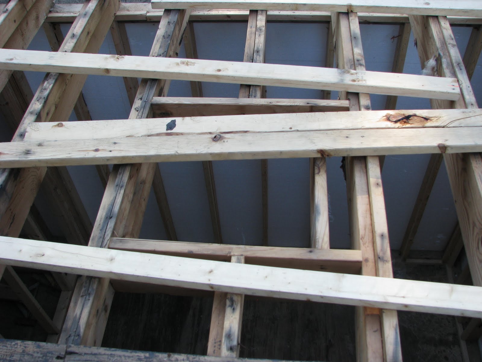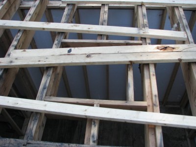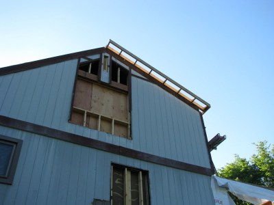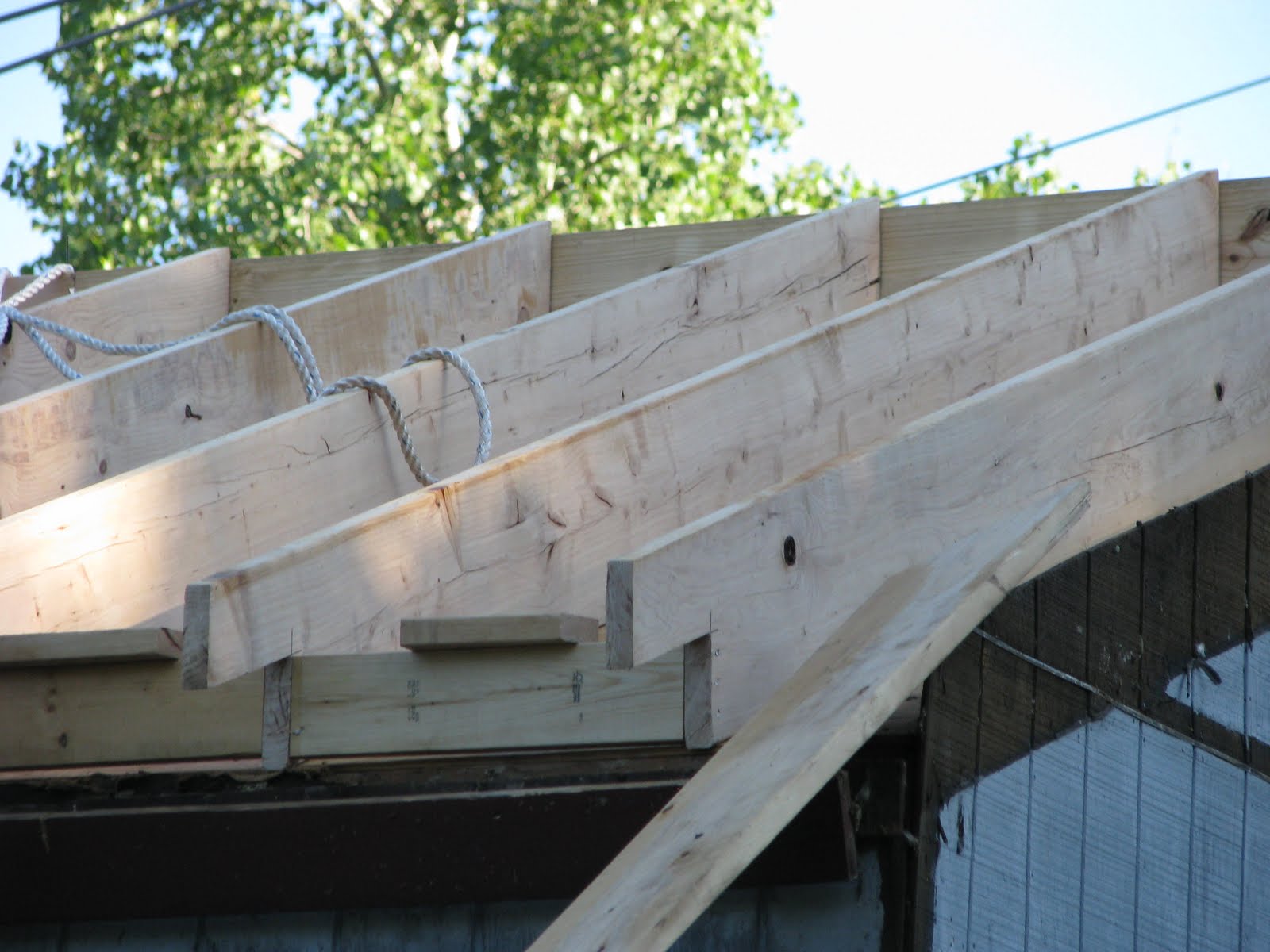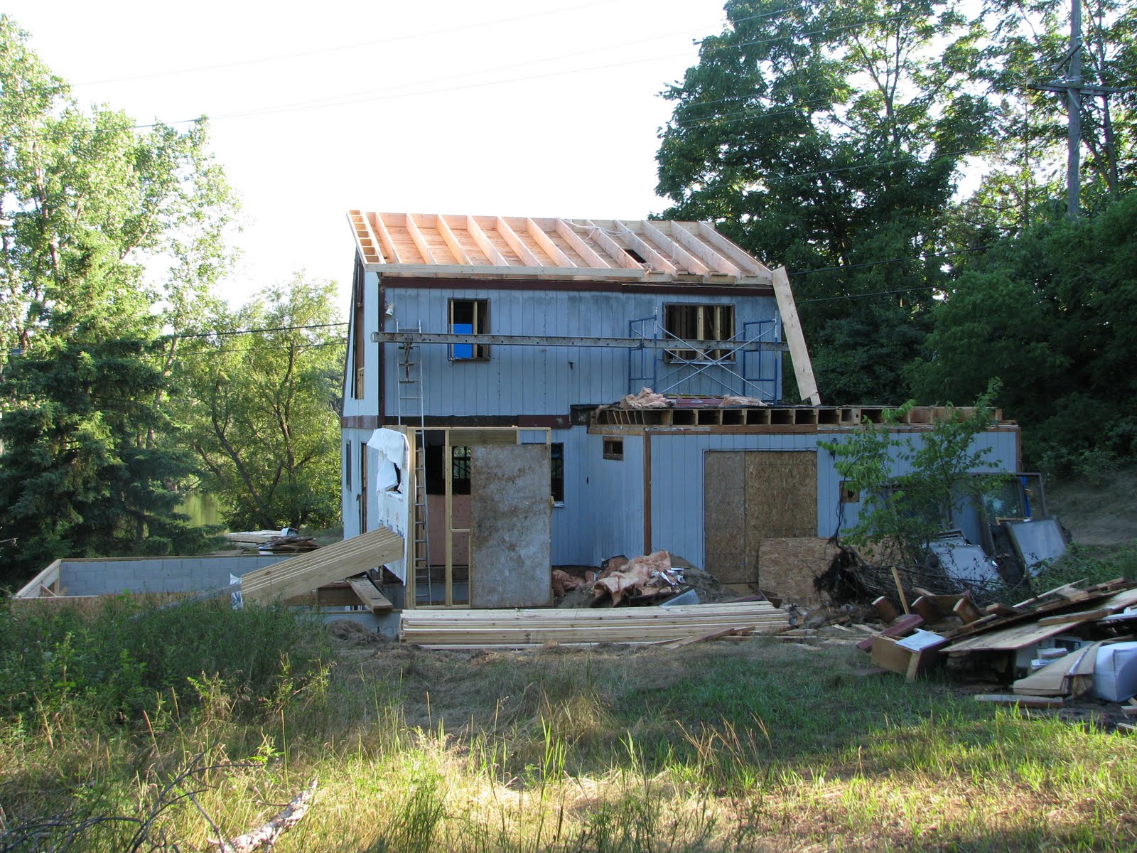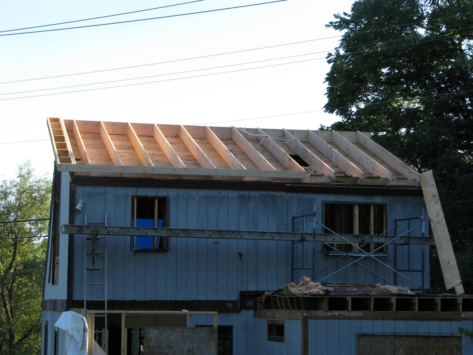 As I mentioned in this post yesterday, the roofers were out on Saturday and ripped all the old shingles and plywood off the roof. Today progress continued on that front, with framing going in on the north side of the house.