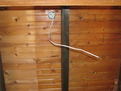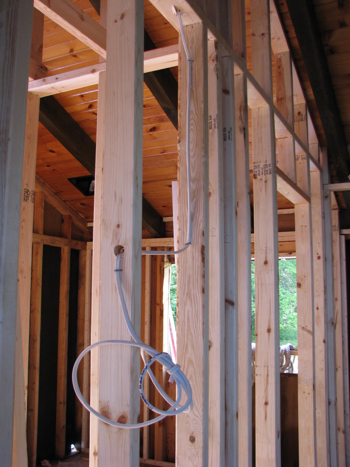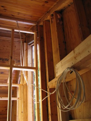 However, the electrician was at the house this morning to start some of the wiring! He was working on upstairs fixtures that will be much easier to do now, vs. when the roof is all insulated and sealed up. We spied the site of our future bedroom ceiling fan/light fixture…
