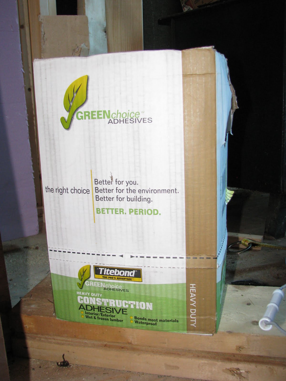 On an unrelated note, I forgot to photograph this yesterday when Steven pointed it out. This is the adhesive that the crew is using. We’d chatted with Steven about our desire to use low-VOC paints and other materials whenever possible, so I was really happy to hear that he had suggested this to the builders (I didn’t even know this stuff existed). Our respiratory systems are psyched too!