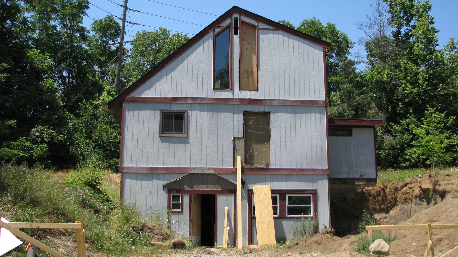 Here is the house from the river side – see that new garage roof on the right? That perfect, south-facing expanse with nothing at all shading it? Yup, that’s where the solar panels will go – just as soon as we can afford it.