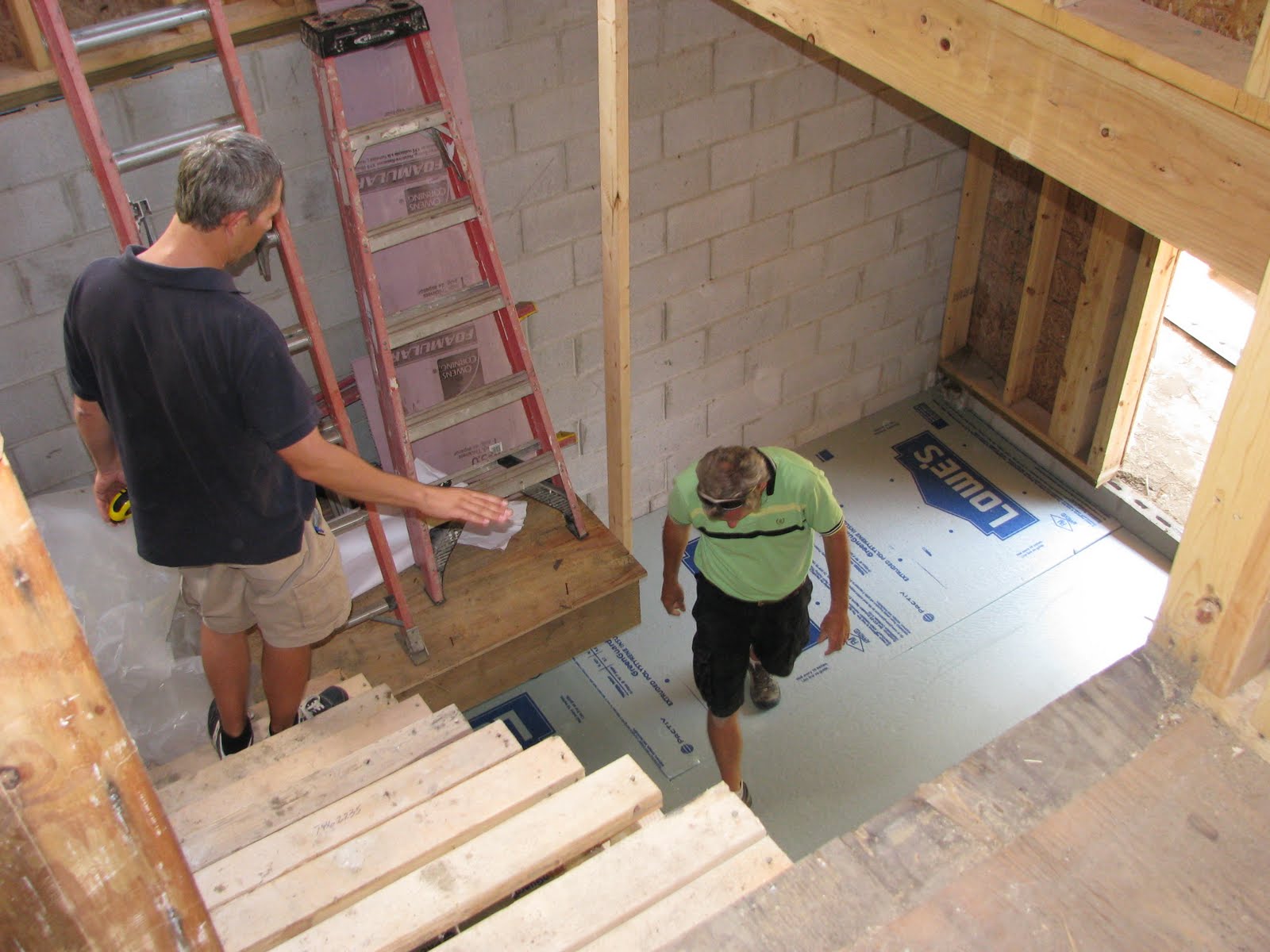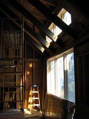 We’re told the foundation crew is coming out tomorrow to finish the foundation in the garage and the new entryway, so the carpenters will be able to finish the main entry stairway (as well as the door on the north side of the house). That’ll be good, because right now that last step is a doozy…