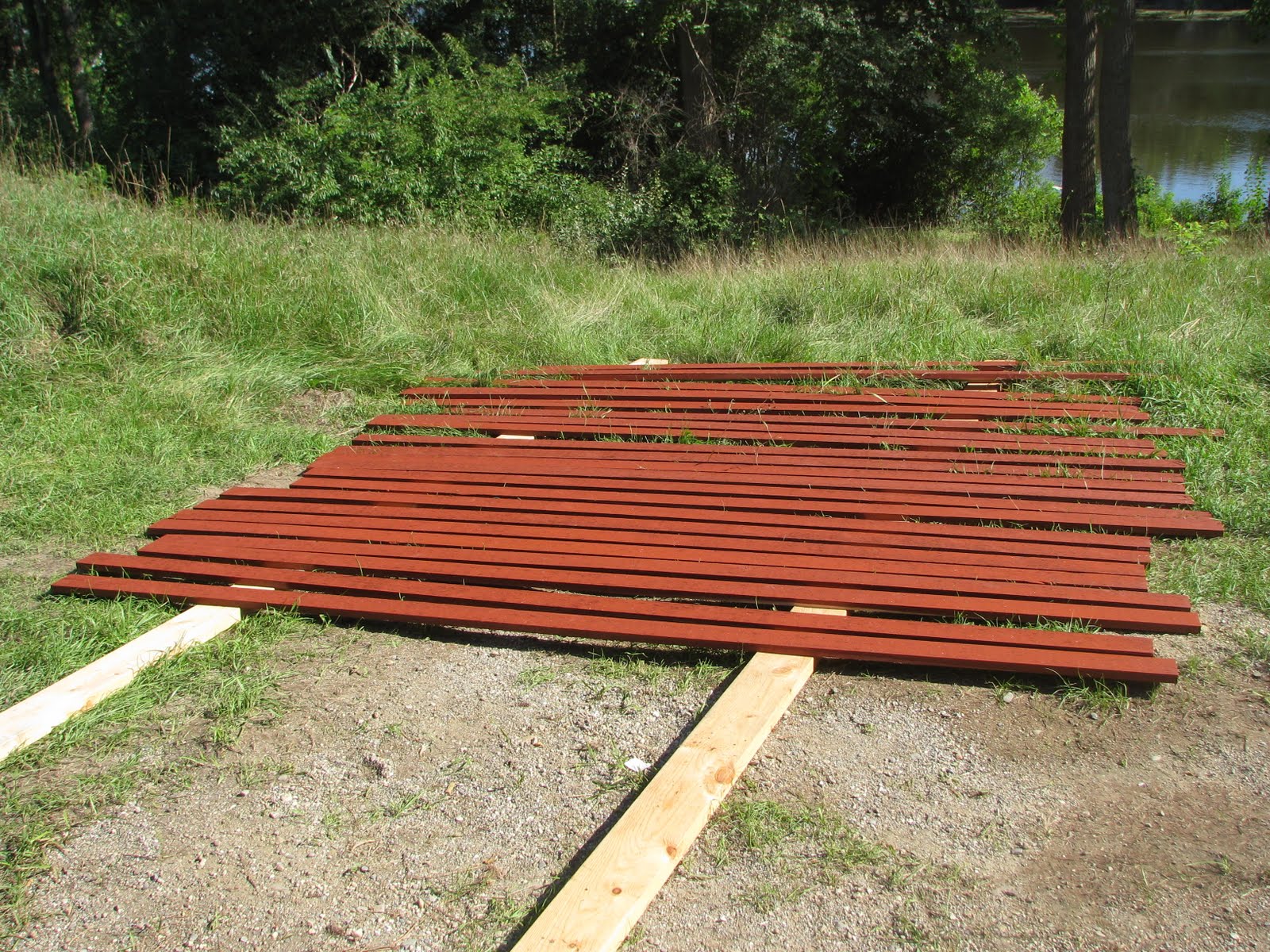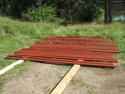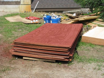 You also may notice some lovely red siding in the foreground of this picture! The painters were hard at work today putting a first coat on the wood for the exterior siding (they’ll put another coat on it once it’s up on the house). It was quite a stack by the time they were getting close to done…