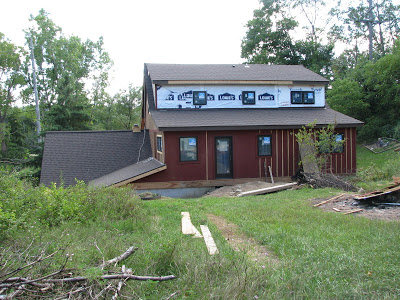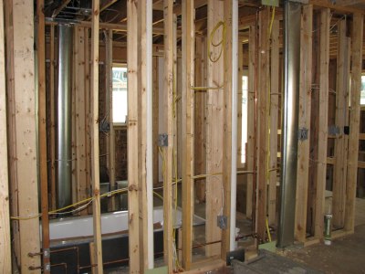I reported already (thanks to the photo update from Steven) that the crew had started on the siding while we were gone. There’s also been a lot of progress on the “house guts” – plumbing, electrical and HVAC. We had another meeting this morning with Steven and the head electrician, mainly focused on figuring out our AV needs. We don’t have a TV, so actually all of our TV-like entertainment (Netflix, MLB.tv) is streamed through a computer to a projector. This has presented some complications in figuring out the wiring, where speakers should go, and such. However, it seems like we came up with some good solutions today. One of the most exciting things about this house is how intentional everything is. Our current and previous places have always had miscellaneous inconveniences – useless spaces, lack of storage, outlets hidden behind furniture (or no outlets a’tall). None of these things are a huge deal, and you learn to live with them. What’s so amazing about this project (especially to a Type-A freak like yours truly) is that everything we own is going to have a place, and the way we live has directed every decision along the way. I seriously feel like the most fortunate human in the world to have this opportunity.