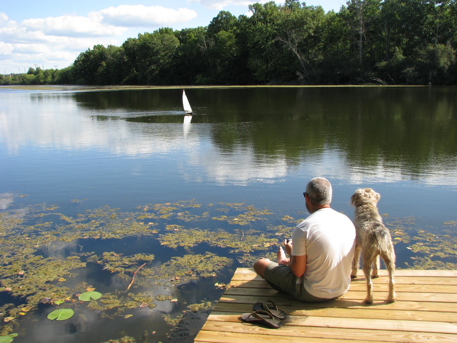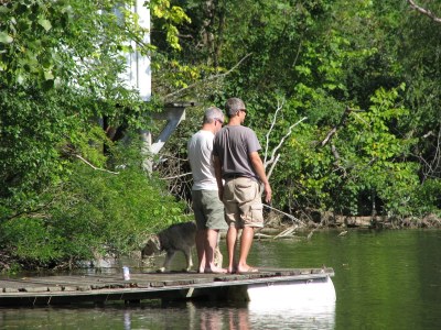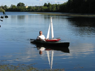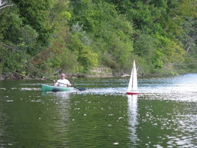 To end on a note of “things that never would have occurred to me as river-based recreation,” Steven came over yesterday with a remote-controlled model sailboat that he built. The wind was a little shifty (can we blame Irene out here in Michigan?), but the boys still had a good time launching and sailing the little boat.