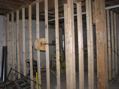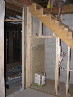 There were some major changes in the basement, where as I’m sure you recall, the spiral staircase of doom used to spring from the fiery bowels of the earth. It is now an ancient (but fear-inspiring) memory, and instead we have some framing for the new mechanical room (where the HVAC, hot water heater, etc. will reside).