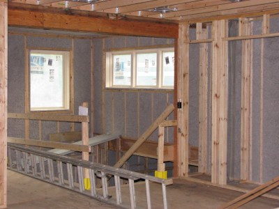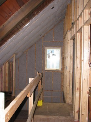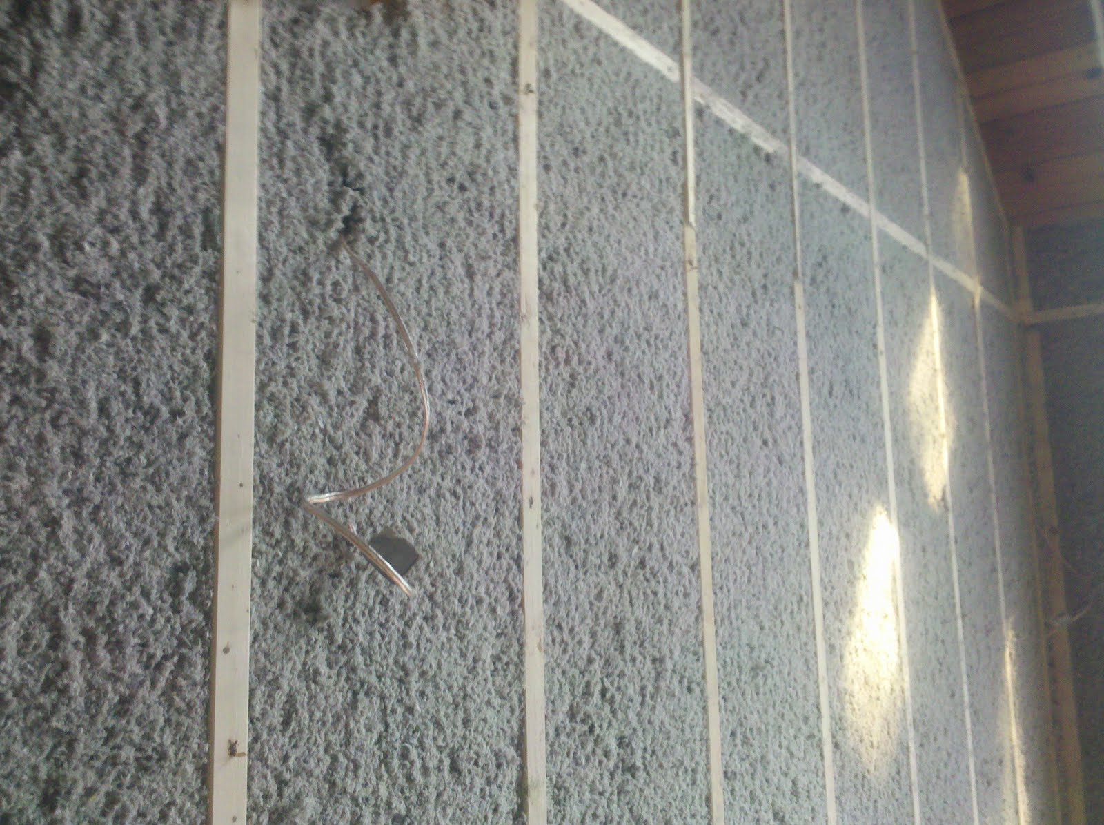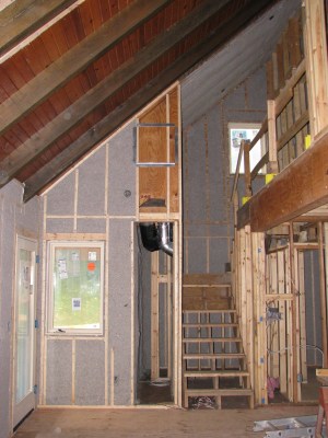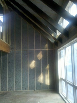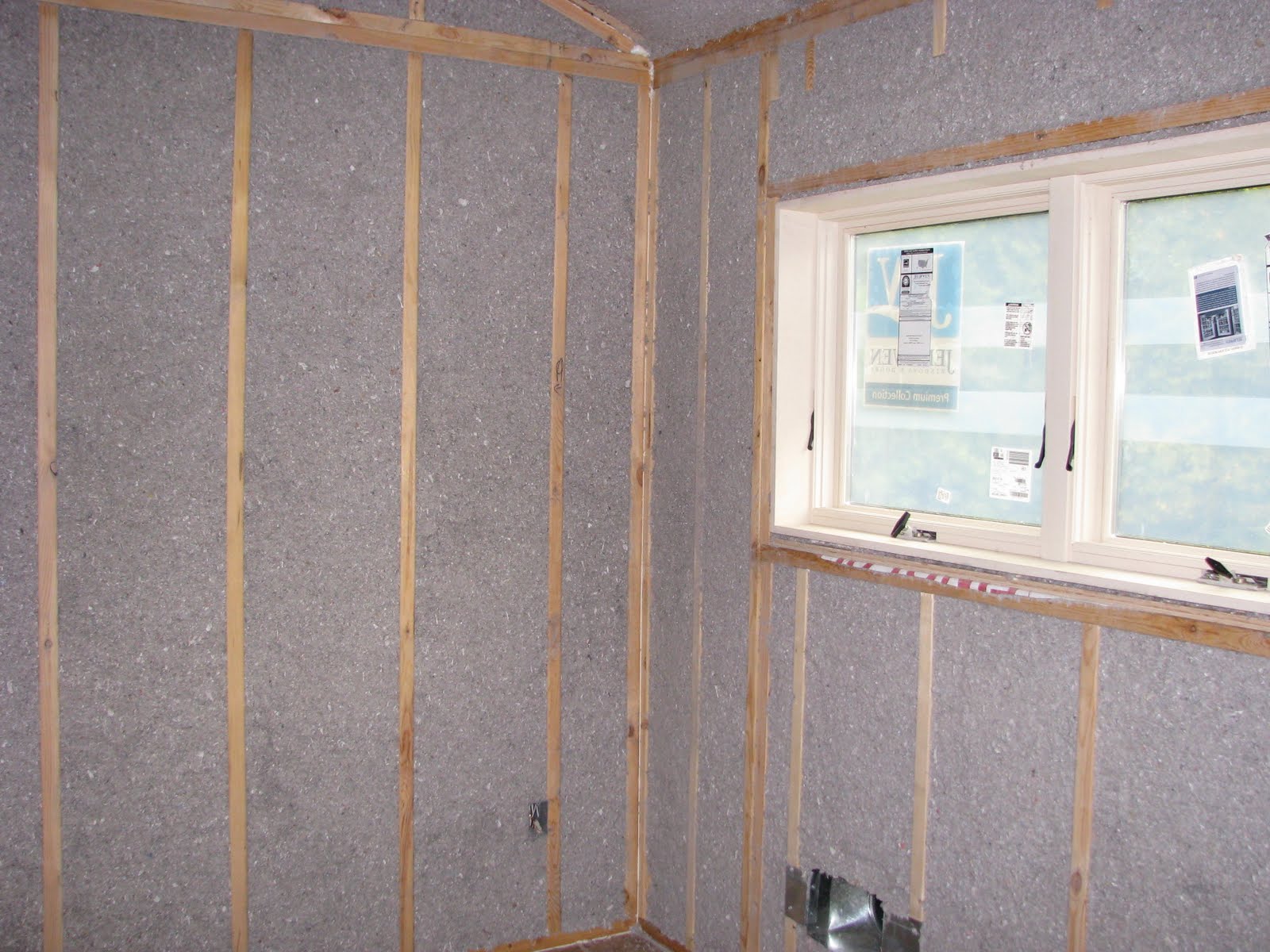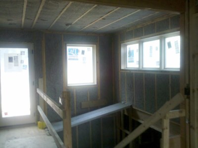 Anyway, as you may have guessed, the insulation is done! Our house now looks like it’s been wrapped in a cozy cozy snuggly blanket of… dryer lint. Actually, I think the texture of it is really neat, and the inside of the house looks so different now because the insulation has basically hidden every last vestige of non-new-ness. All to say, I was psyched to take a bunch of photos to share with you. I got to the house and, as usual, did the requisite jumping up and down while making high-pitched sounds involving lots of vowels. I turned on my camera, and almost simultaneously: (a) the lens, which had gone from an air-conditioned 70°F to an is-this-really-September-in-Michigan 97°F, promptly fogged up; and (b) the battery died. Sooooo. What’s a girl to do? I snapped a few lame-o cell phone pictures, and I promise I’ll update this post later this weekend with some better shots.