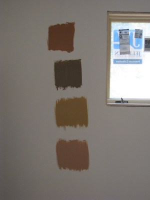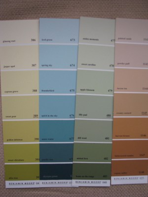Steven and I met yesterday to talk colors, and came up with a paint chip palette that we were decently happy with – or at least happy enough that we were going to try to find some samples in this general viscinity.