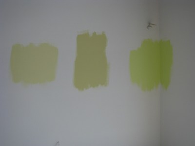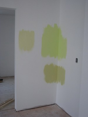 From left to right these are Cypress Grove (388), Sweet Pear (389) and Fresh Cut Grass (2026-50), all from Benjamin Moore (as are the rest of the colors in this post). I loved Fresh Cut Grass most purely as a color – it is so cheerful! – but once it was up on the wall I realized how bright it was. I told Brandon that it almost verged on a shade you’d find in a highlighter marker. The other two are less saturated, but I think Sweet Pear may be a little too dark, and Cypress Grove a little too yellow. Sigh. Not in love with any of them yet, although I took this with the Cypress Grove still wet, so I am holding out hope for that one… Anyway, here they are by the dining room (the corner furthest from the windows), with Cypress Grove on the left, Fresh Cut Grass on the top right, and Sweet Pear on the bottom right: