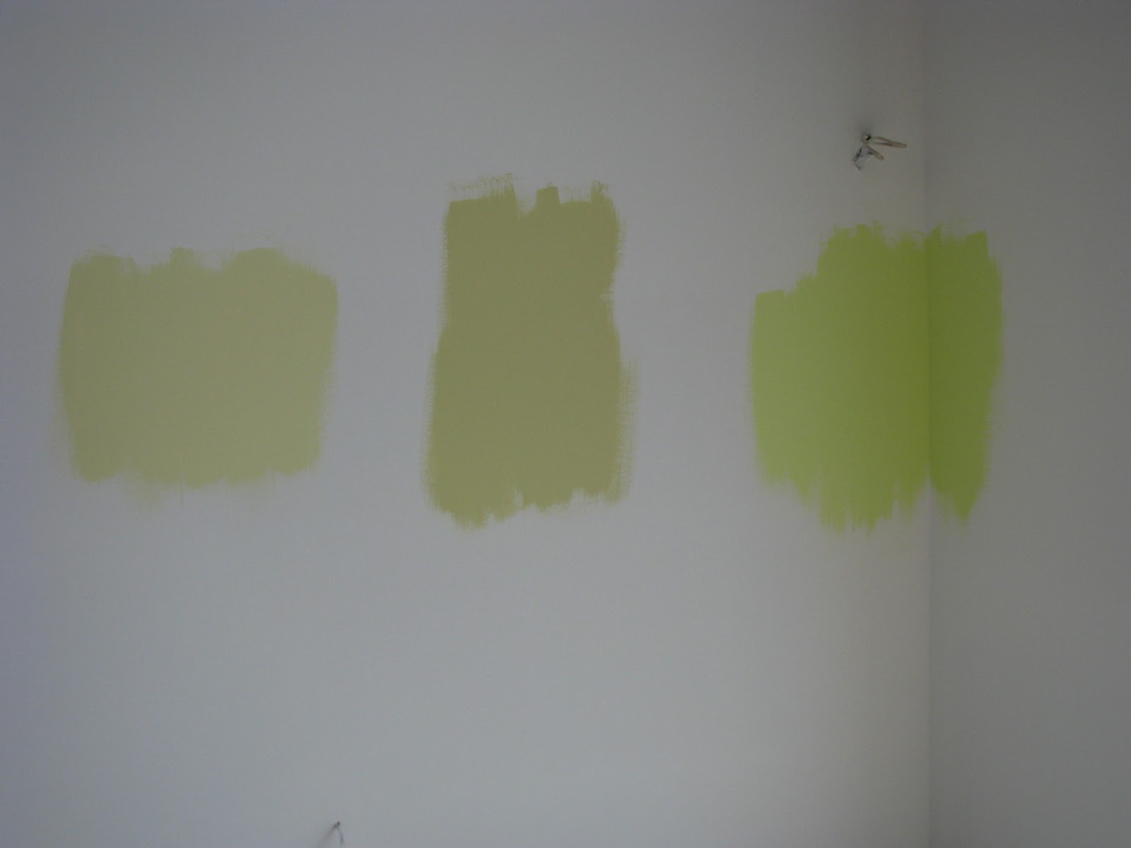 From left to right these are Cypress Grove (388), Sweet Pear (389) and Fresh Cut Grass (2026-50), all from Benjamin Moore (as are the rest of the colors in this post). I loved Fresh Cut Grass most purely as a color – it is so cheerful! – but once it was up on the wall I realized how bright it was. I told Brandon that it almost verged on a shade you’d find in a highlighter marker. The other two are less saturated, but I think Sweet Pear may be a little too dark, and Cypress Grove a little too yellow. Sigh. Not in love with any of them yet, although I took this with the Cypress Grove still wet, so I am holding out hope for that one… Anyway, here they are by the dining room (the corner furthest from the windows), with Cypress Grove on the left, Fresh Cut Grass on the top right, and Sweet Pear on the bottom right: