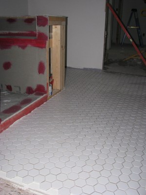 There was also progress in the master bathroom upstairs – the floor tiles are laid! I heart white hexagons. It is like a beehive of cleanliness.