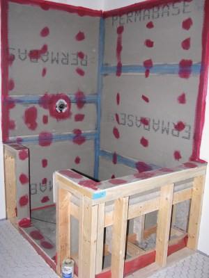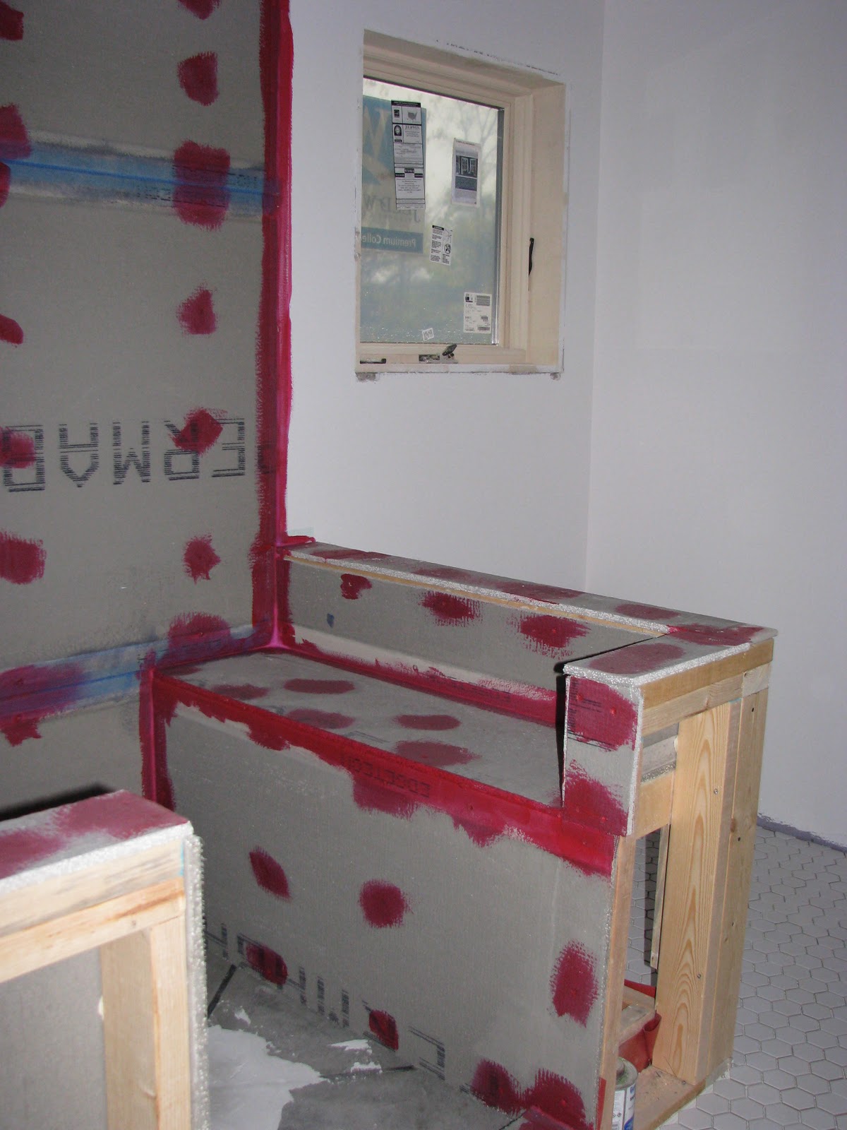 The shower is all prepped for tiles, including what I like to think of as the leg-shaving bench: