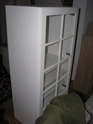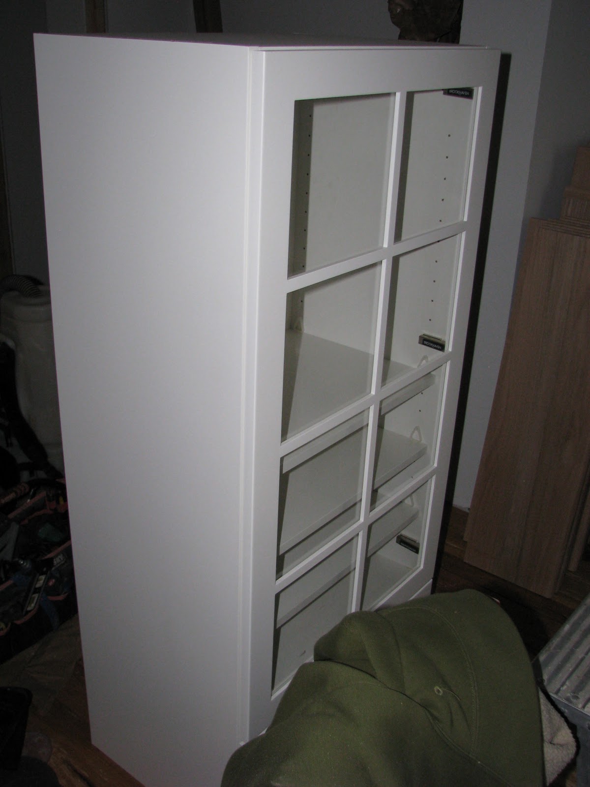 The fridge will go in the space at the left of the pic above (the cabinet on the floor is just there temporarily on its way somewhere else). The range will be in the middle, with a microwave above, and the pretty glass-fronted cabinet in the pic below will be in the space at the top right. The cabinets will be trimmed out all the way to the ceiling, and we’ll eventually put in a tile backsplash, so you actually won’t really see any of the color on this wall. And in front of this whole expanse will be an island, with more cabinetry, the sink, a dishwasher, and a bar height counter with stools.