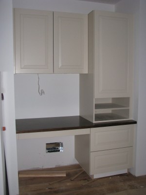 The other hole is unfortunately a big chunk of paint/finish missing from one of the cabinet doors in the little desk area (cue sad trombone). I haven’t pointed this out to the GC yet but it’ll have to be replaced/repaired… I am actually stewing a bit over the whole desk region, because I am feeling a bit “meh” about the color we picked for the cabinets.