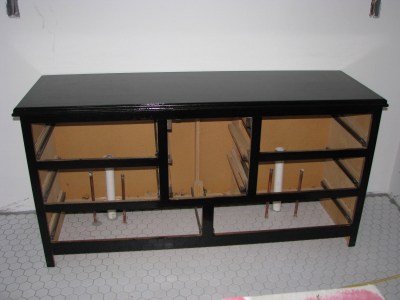 The master bathroom vanity that we are making out of an old refinished dresser has also been moved to the bathroom. We have to cut holes in the top to accommodate the rectangular vessel sinks and faucets, and I still have to figure out how exactly I’m going to shorten all the drawers so they don’t hit the plumbing. Oh and add trim around the bottom. Details, details – it is going to be super pretty when it’s done! I am really pleased with how the staining/polying came out.