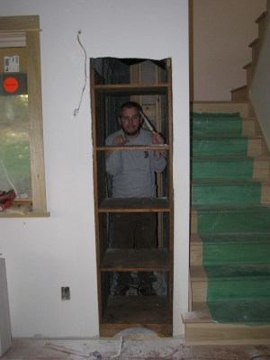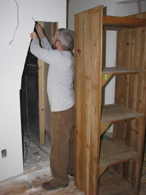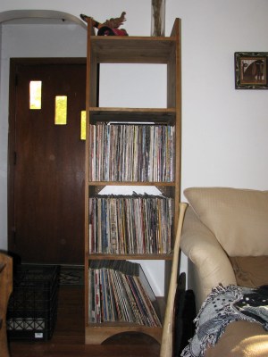 I’m not sure exactly what we did – it certainly wasn’t dusting our current shelves. Whatever it was, I am pleased as punch that one of our house dilemmas has been solved in a bizarrely fortuitous way. To back up, one of the many (many) things we’re really excited about is having recessed shelving in the living room to house a bunch of media stuff – mainly, the mini-computer and projector that we use instead of a TV, and a receiver for the speaker system. Mounting the projector at the top of this shelving unit will get it up high enough that we won’t be projecting silhouettes of people, wagging dog tails, etc., like we have been for the past five years (woohoo!). It will also provide some storage for part of Brandon’s record collection.