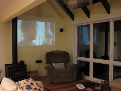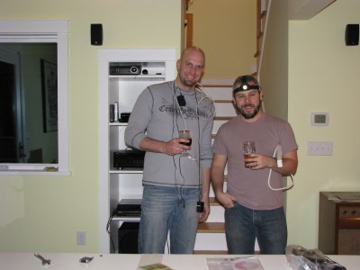 Another project that we wanted to tackle was getting the media cabinet set up. This involved squirming through a tiny access opening to plug everything in behind the shelf so we won’t see any wires from the living room. My cousin, his girlfriend and their dog were visiting at the time, so he got recruited to help out (thanks Josh!). As you can see below, this required some auxiliary equipment (headlamp and beer). The guys got it all done though, speakers wired and all, so now we can watch TV, stream stuff on the internet, or listen to records all from the same central receiver/projector setup. It’s fantastic.