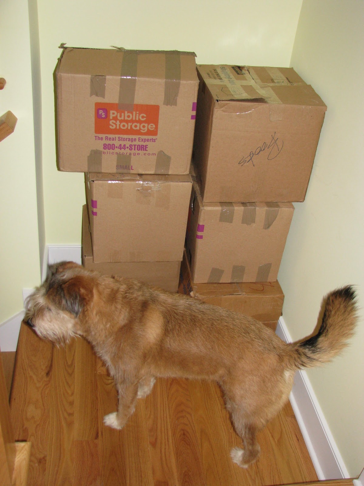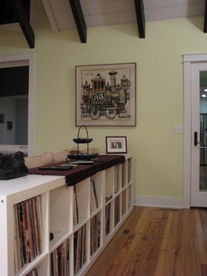 This is the stairway landing, where we plan to build in bookshelves. That’s not done yet, so instead we just piled all of the boxes containing books into the space where the shelves will be. It’s not quite the same effect.