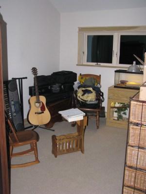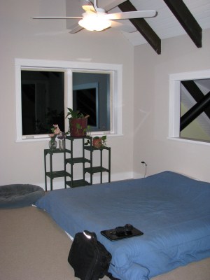 This is the “little room,” the backup guest room upstairs. It has become the random junk room. Also note the unpainted but caulked trim… still some work to do here!
