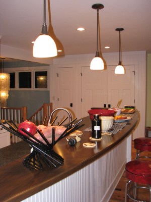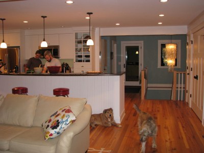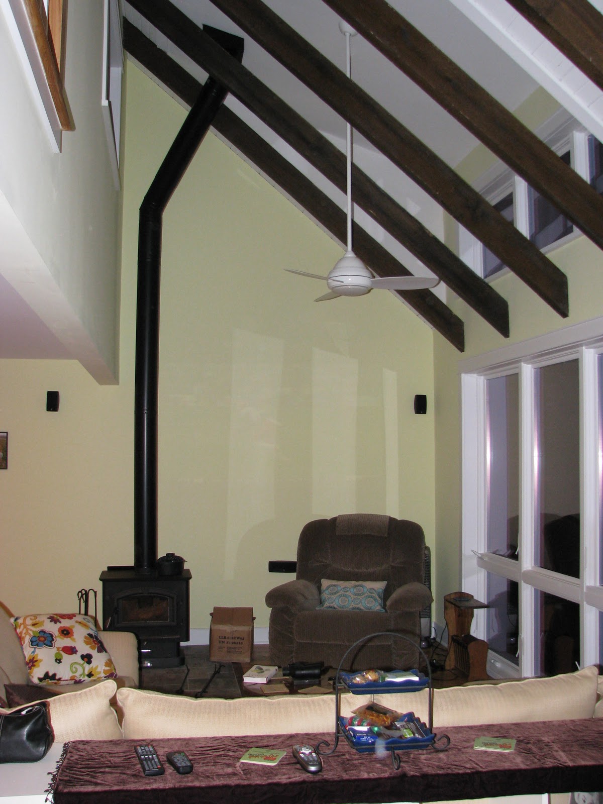 I wanted to share a few projects that have been completed in the last week, and then some photos of the house in its current state. First off, the wood stove pipe installers came last Tuesday to run the pipe out the ceiling. It was going to run straight up and out the dormer, but when the guys got up there and knocked on the ceiling they got worried because it sounded like a rafter was just exactly in the way of where the pipe was supposed to go. Lucky for them (and us), the house belongs to an obsessive photodocumenter (that would be me). I pulled up photos from when the dormer was being built, and yes indeedy, there was a big ol’ rafter in the way. The only option then was put an angle in the pipe – I like to describe it as “jaunty.”