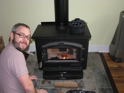 Hahaha. It looks a little funny, but it’s actually not very noticeable unless you’re someone who spends a lot of time looking at the ceiling. And it’s totally worth it for the fantasticness that is the wood stove. Here is B starting our very first fire. The installer told us that we should start it really tiny and build it up over the course of 3-4 hours, so that’s what we did. We have had it going pretty much constantly since then, and in fact we’ve been heating the whole house this way.