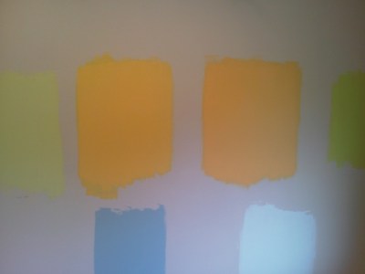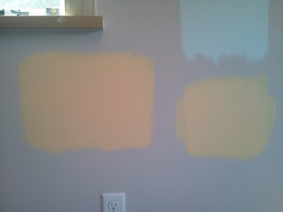 These are the colors one shade lighter than each of the ones mentioned above – Yellow Haze (L) and Morning Sunshine (R). I think something in this ballpark will work better given the very tall expanse of wall we have going on in this room. They look pretty washed-out here (again, crappy cell phone photos, sorry, have been meaning to buy camera batteries for ~2 months) but in real life they are still bright and cheerful without being ker-azy.