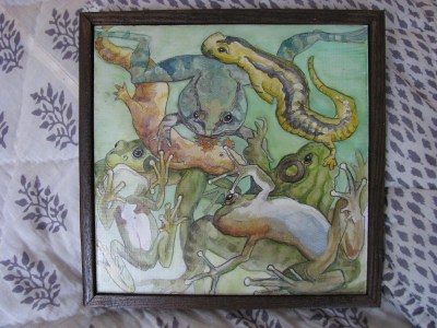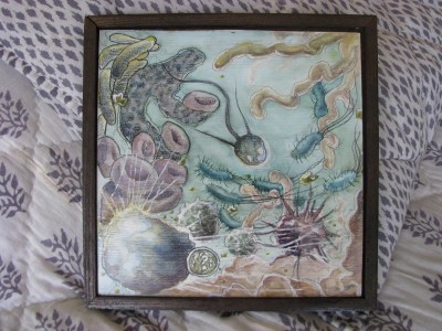 Do you guys remember my friend Corey and his amazing Turtle House painting? Well, in the spirit of nursery-related news and bragging about how awesome my friends are, I had to share my latest art acquisition. These four panels (each about 10″x10″) were featured in a show Corey did in Columbus.