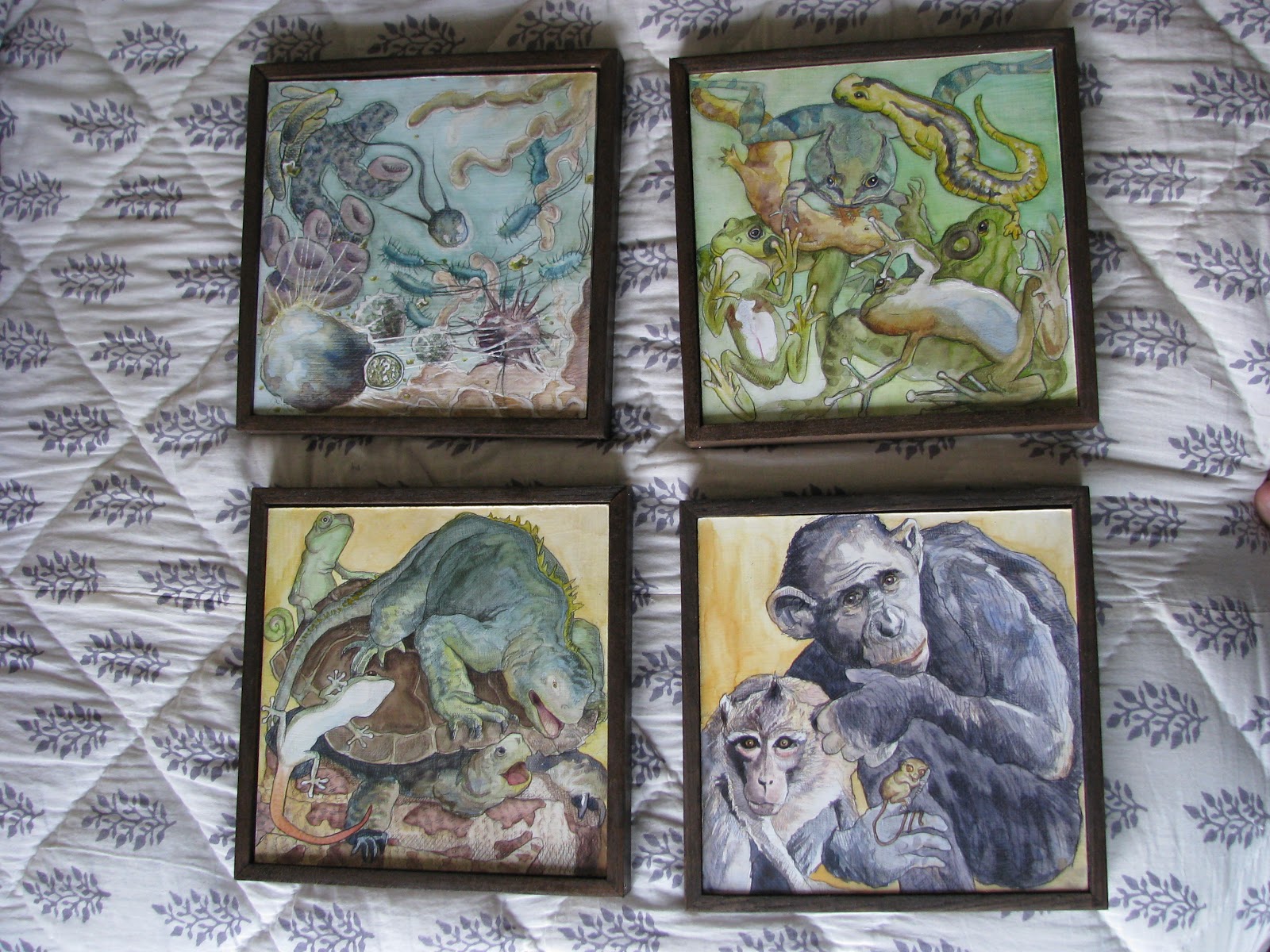 Do you guys remember my friend Corey and his amazing Turtle House painting? Well, in the spirit of nursery-related news and bragging about how awesome my friends are, I had to share my latest art acquisition. These four panels (each about 10″x10″) were featured in a show Corey did in Columbus.
