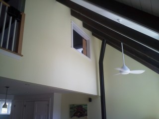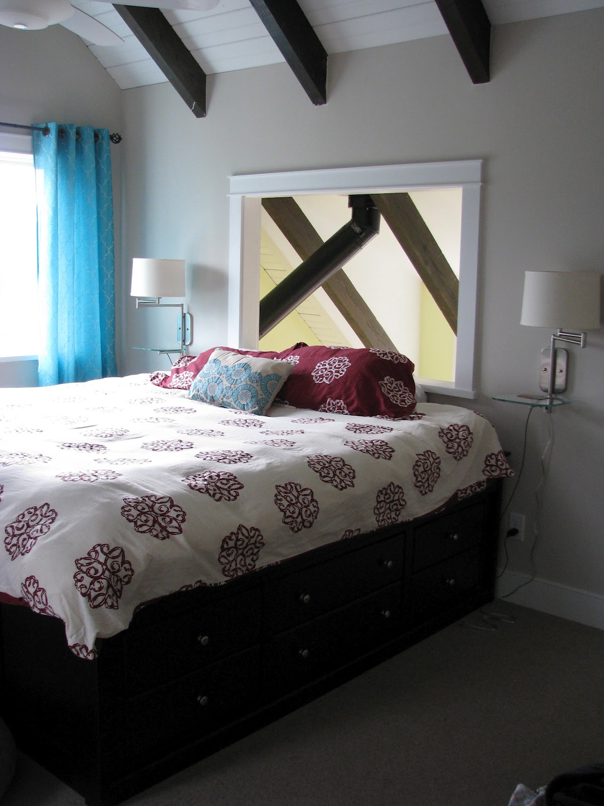 Well it seems we have our first “wish we would have…” moment with the new house. Remember our master bedroom with the large interior window over the bed? Brandon and I have conflicting opinions about it. He is in the unreservedly pro-window camp. I enjoy the window in the morning, when I can peek out and see the river – but after living with it for a year-plus, I can also say that (a) it’s a bummer when people are in the living room and you’re trying to sleep; and (b) something about the empty space over my head just bugs me in an indescribably feng-shui-y sort of way. I can’t really explain, and Brandon thinks I’m nuts, but when I’m going to sleep I like to feel like I’m tucked in a safe little spot. The big open expanse of space just gives me a vague feeling of discomfort and kinda makes my skin itch.