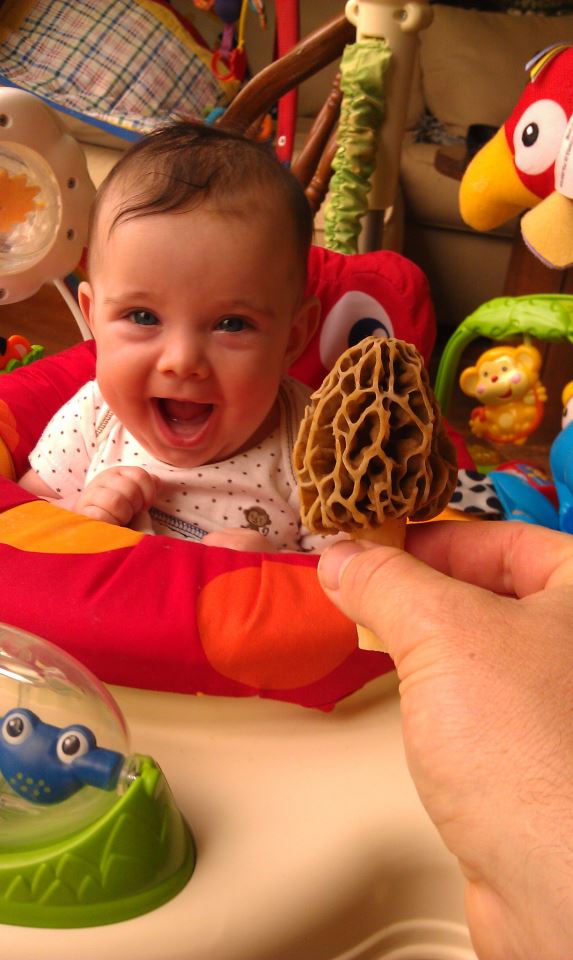 Gratuitous adorable baby excited about a morel
