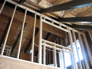 Idea #2 was one Brandon randomly threw out yesterday, when he said “I wish we’d thought of doing this while the construction was still ongoing – we could have just done a pocket door.” I think a little light bulb pinged on over my head when he said that. I hadn’t felt totally satisfied with the barn door idea, partly because I enjoy the way the window looks now – between the roof beams, the white decking, the hallway bannister, the stove pipe… there is a lot going on up there, and I thought a big sliding door might look a little cray (as the kids say).
