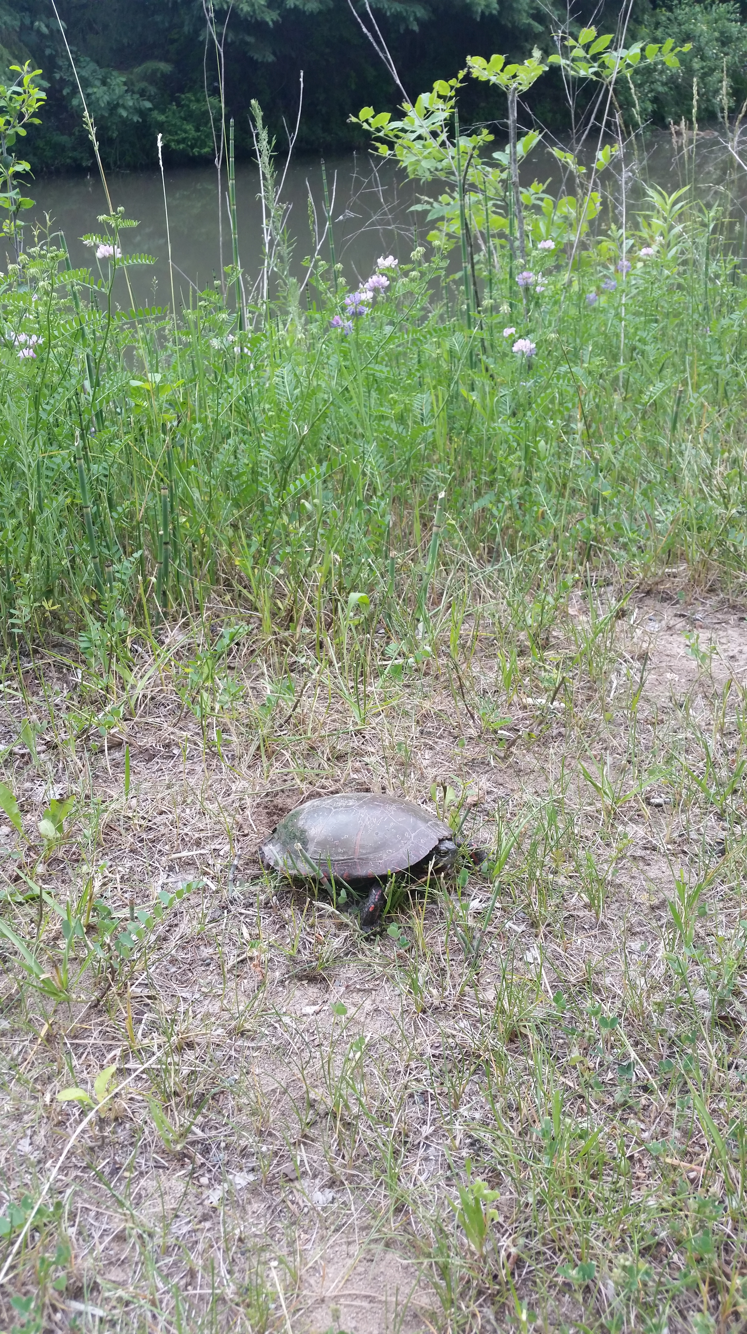 3. When I was cleaning the duck water, I tossed my hose and almost hit a little friend coming up out of the stream. Later on, I saw the same turtle (maybe?) up by the pond. Looked like she might have been searching out a nesting site. I am strongly in favor of more baby painted turtles. 🙂