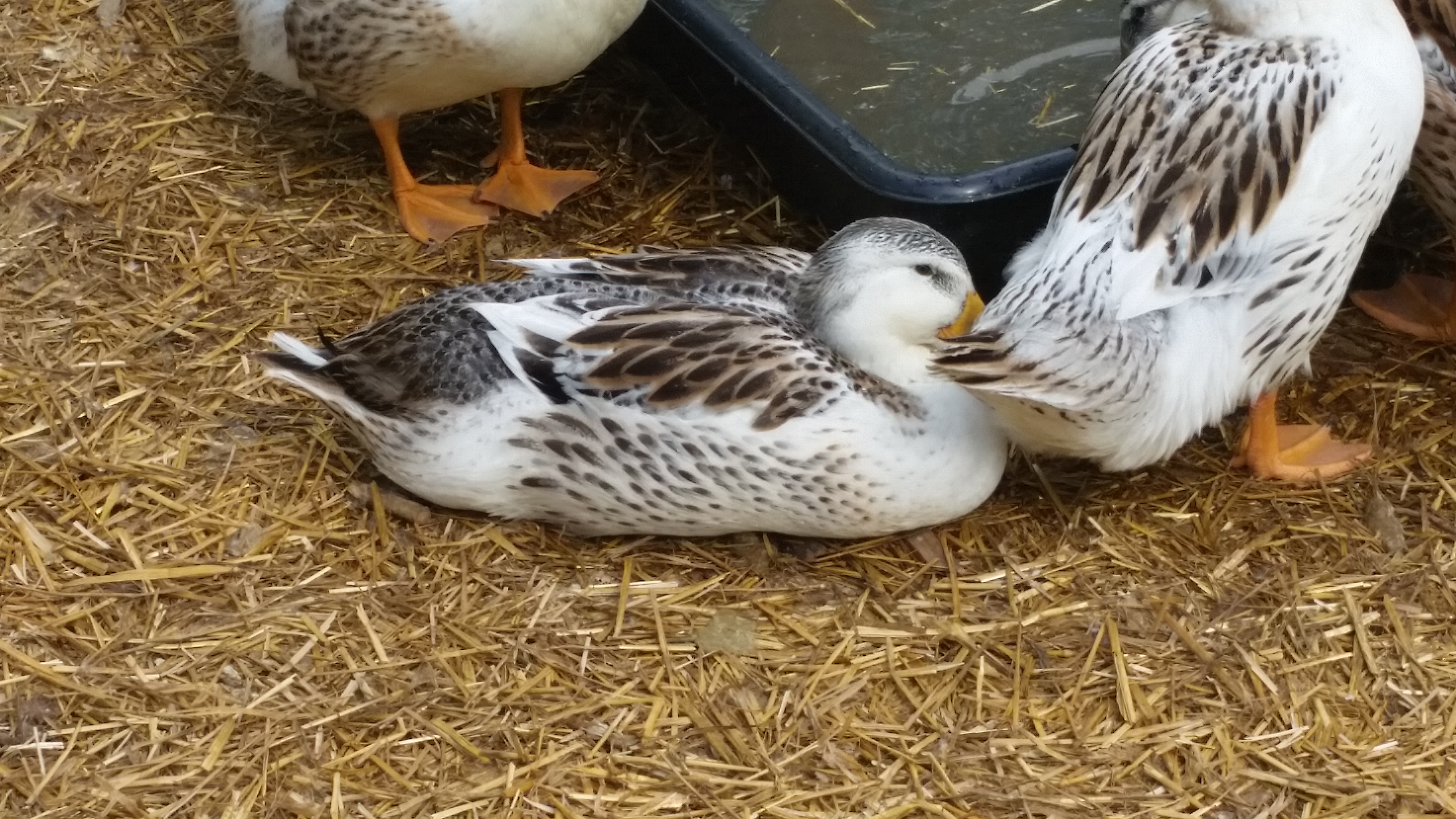4. I tried to get a shot of one of the ducks with possible drake feathers, but this was the best I could do. See the single feather curling up on the tail of the duck laying down? Compare that to the standing duck. What’s really interesting is that I can count 4 ducks with definite curly feathers, and some are the very light colored individuals that we thought were female.