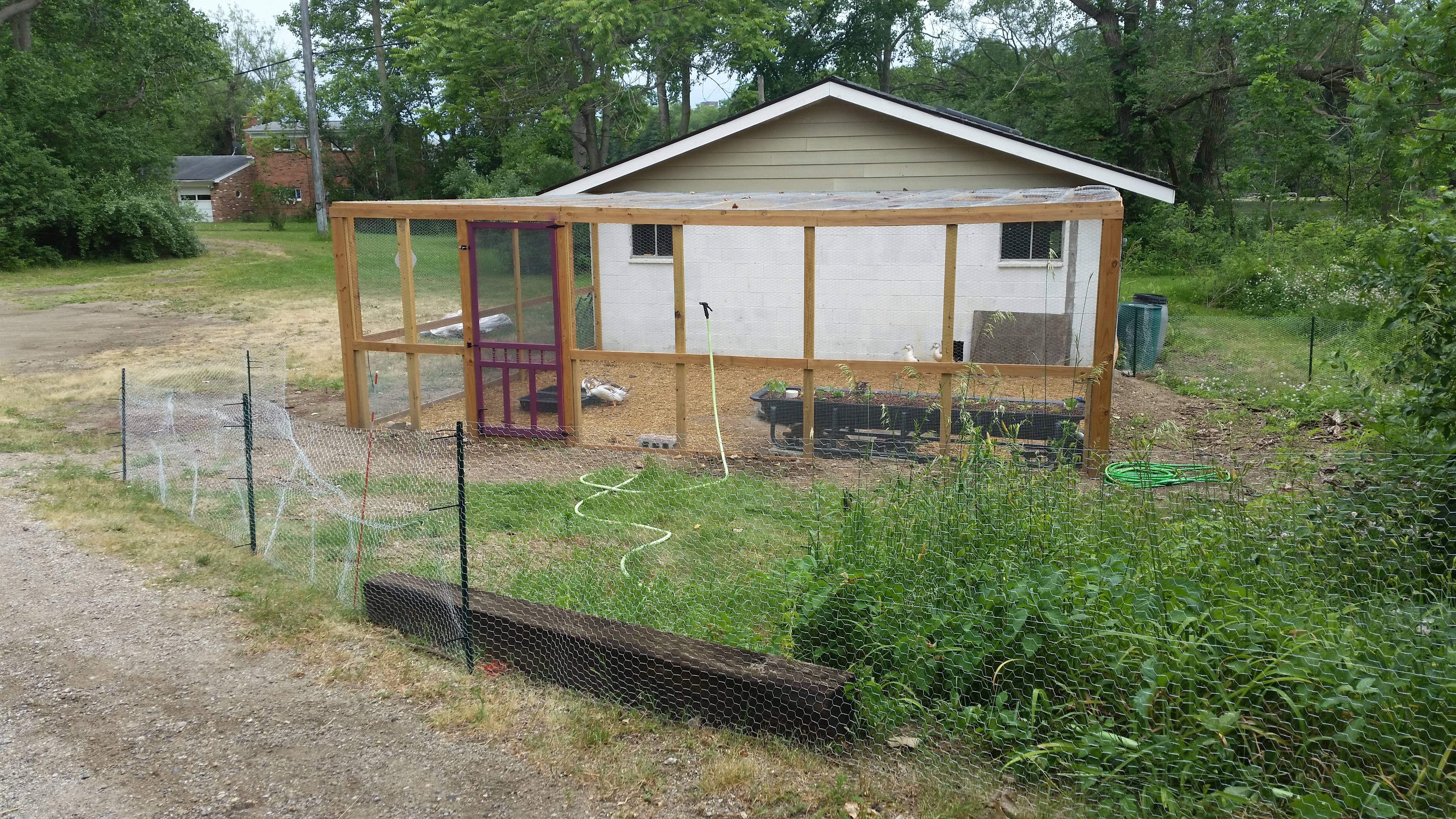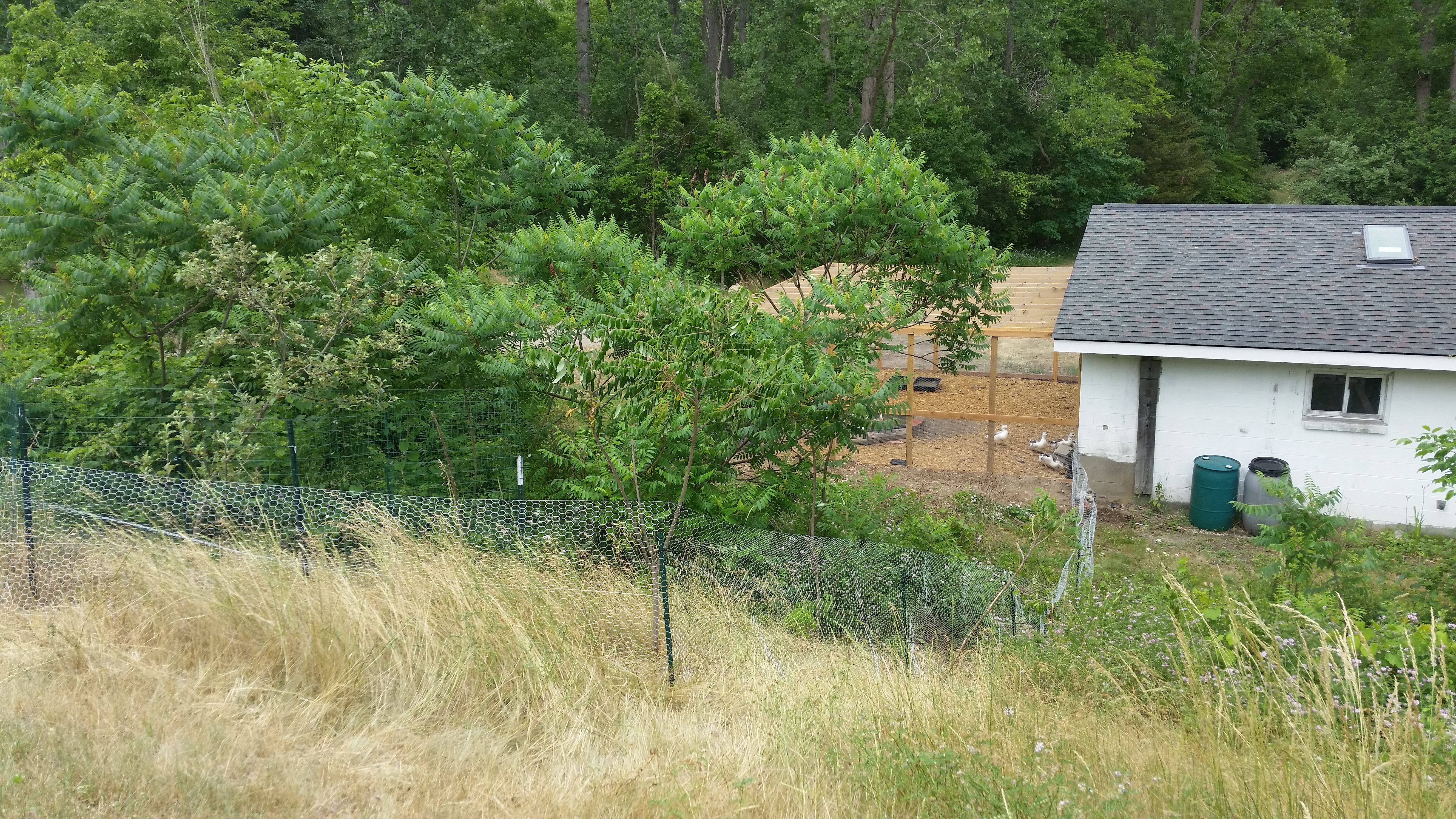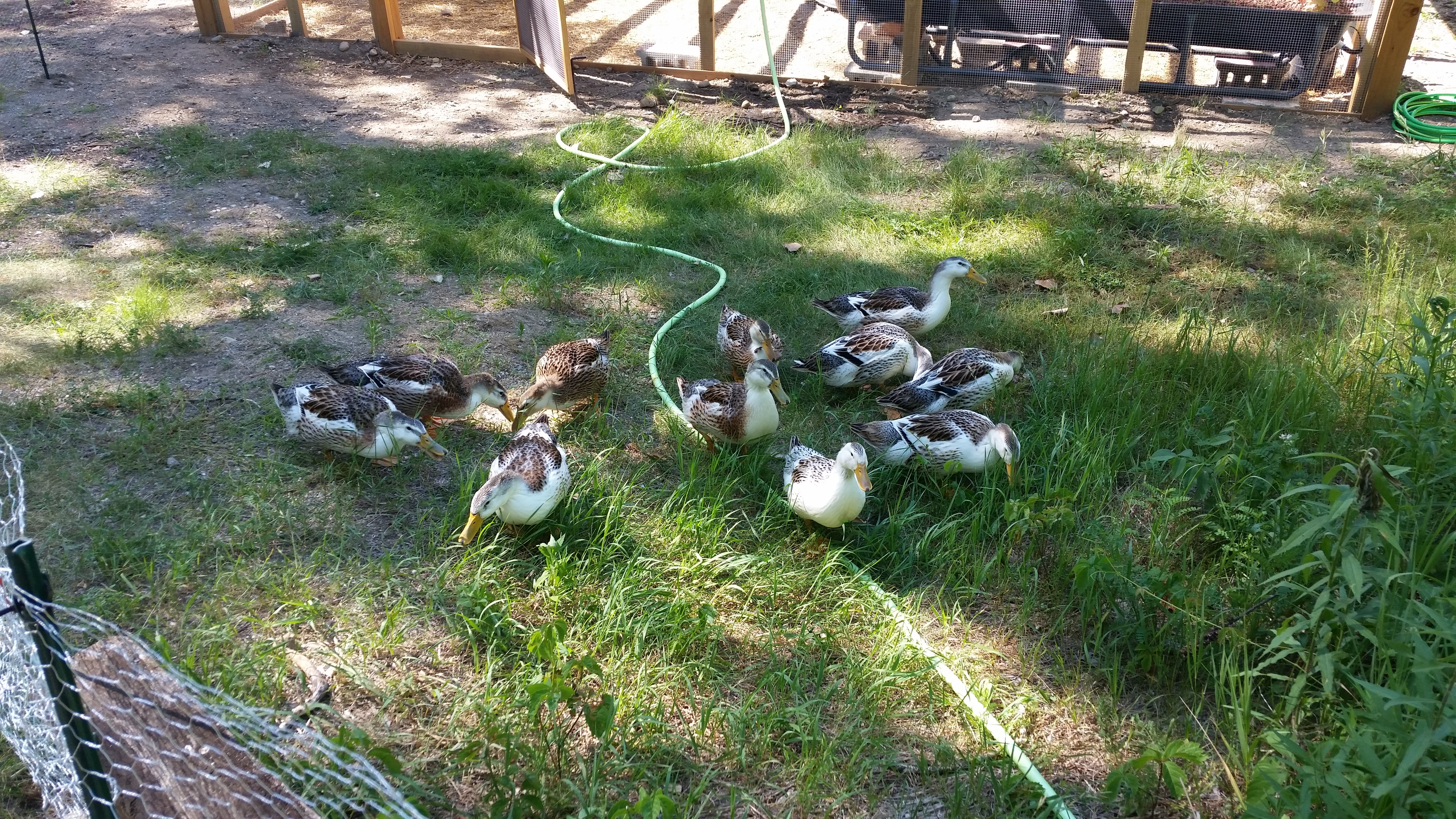 The ducks have been very cautious so far–so much so, that they haven’t even discovered the pond and stream they now have access to! Here’s a video from the first time we let them out… definitely not a mad rush to get out! They spent the first several minutes just nibbling on greens barely over the threshold.