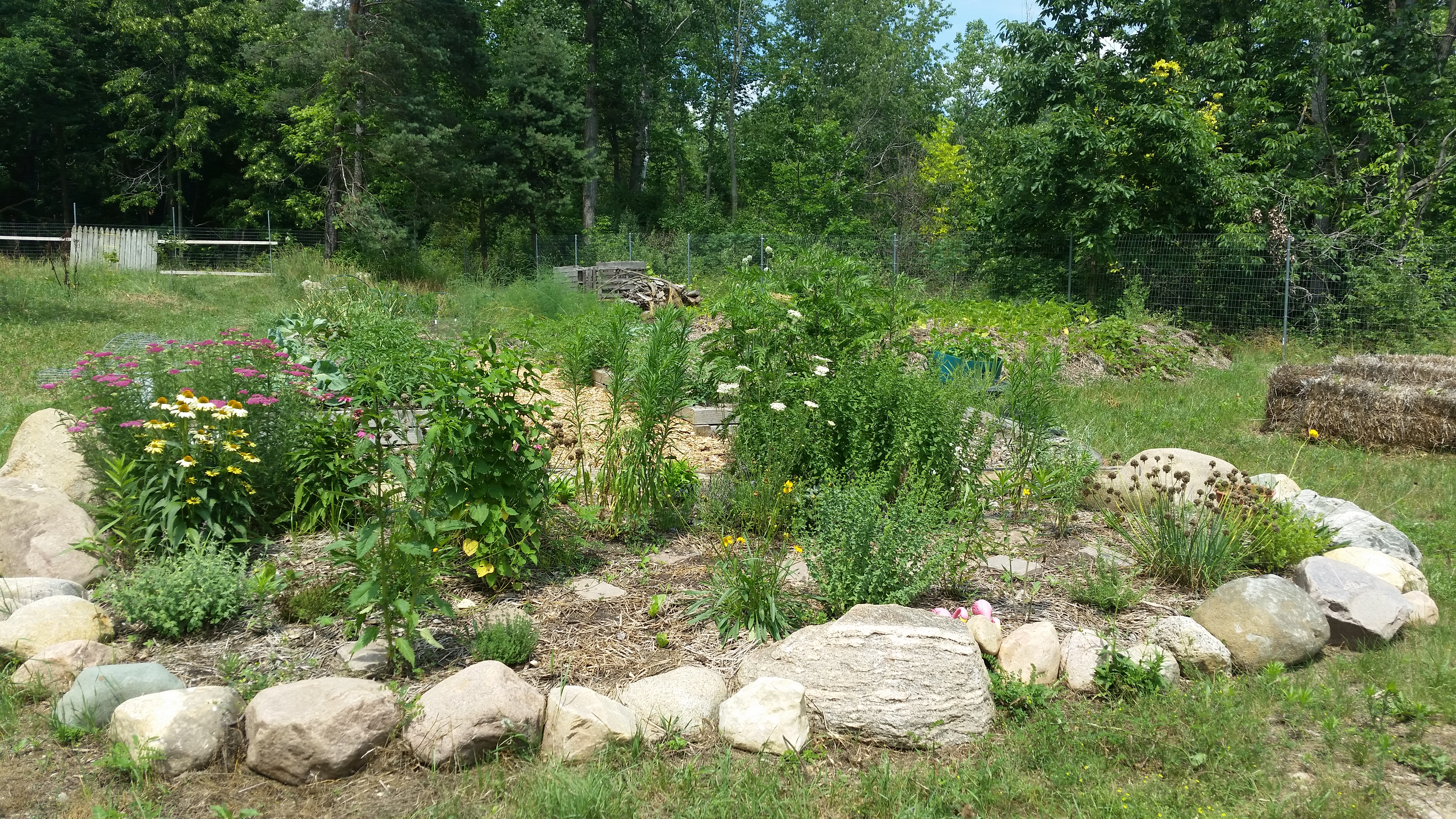 The “rock bed,” which I mainly use for herbs, greens, and pollinator-friendly flowers, is looking really lovely at this point.