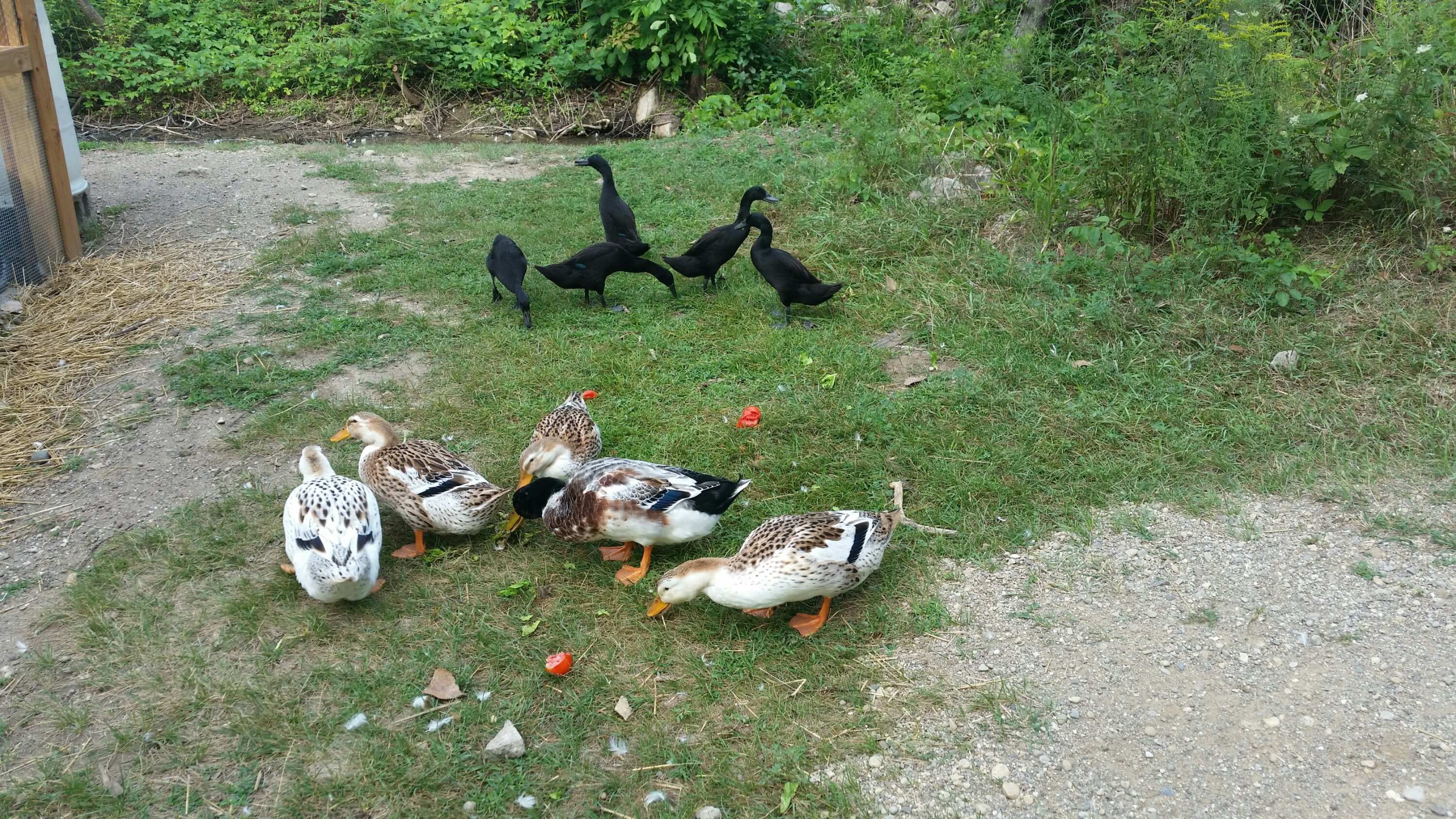 Here’s a picture from our second floor showing the big pond to the left, and duck run to the right. You can sort of make out the grow bed and duck pool in the run. The stream runs through a culvert under the driveway, and then through the brushy area at the bottom right of the photo. (Incidentally, if you look carefully, you can also see the yet-unused duck ramp going into the big pond. We have tried herding them up there at least 3 or 4 times now, and they won’t go in! They are homebodies. Also total wusses.)
