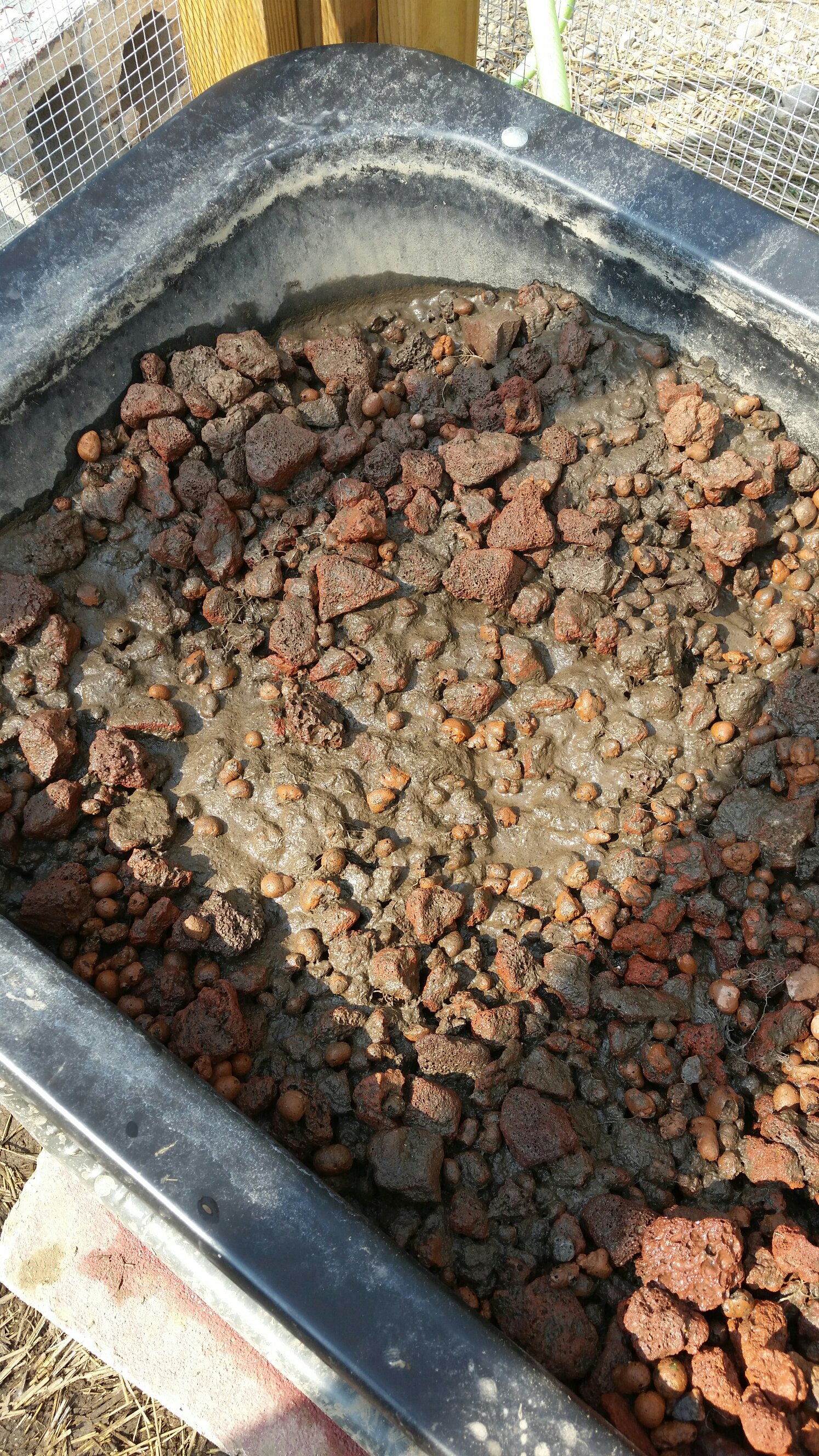 So a couple weeks ago I hit my limit with (literally) mucking around with all of this. I decided to shut down the quackuaponics, and use the (former) grow bed as a flow-through water trough. Cleaning out the system was… well, a picture’s worth a thousand words.
