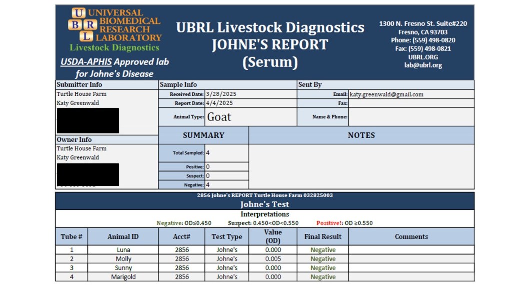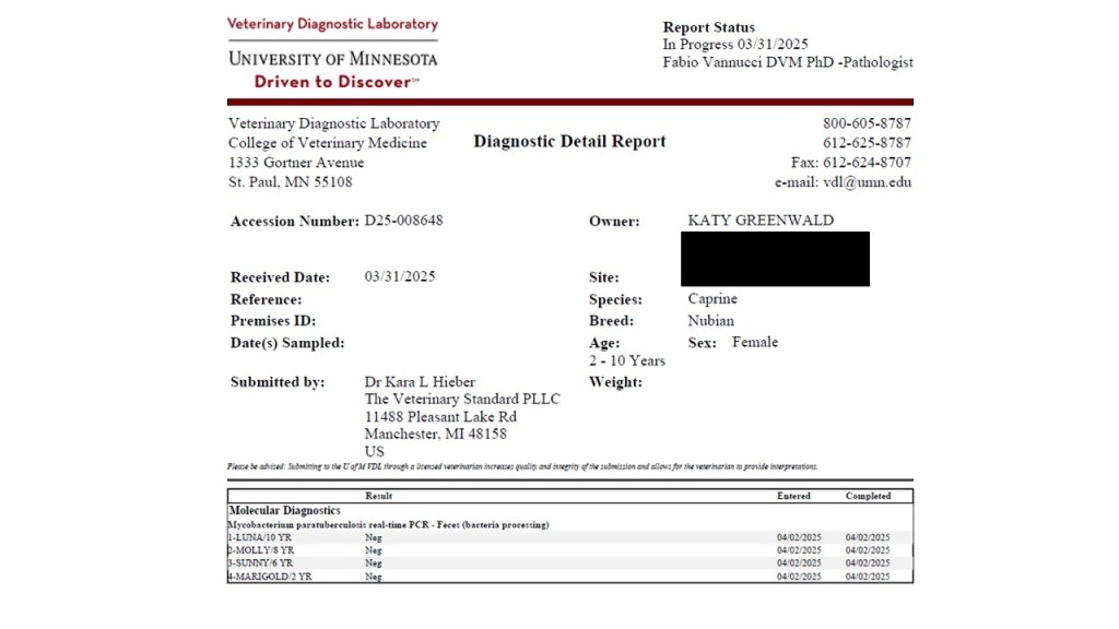 We are proud to maintain a disease-tested herd. Our 2025 results for CL, CAE, and Johnes are below. Please note that like many others, we had a scare with Luna’s results for the Johne’s protocol WADDL was temporarily using. Follow up blood and fecal PCR tests were negative.